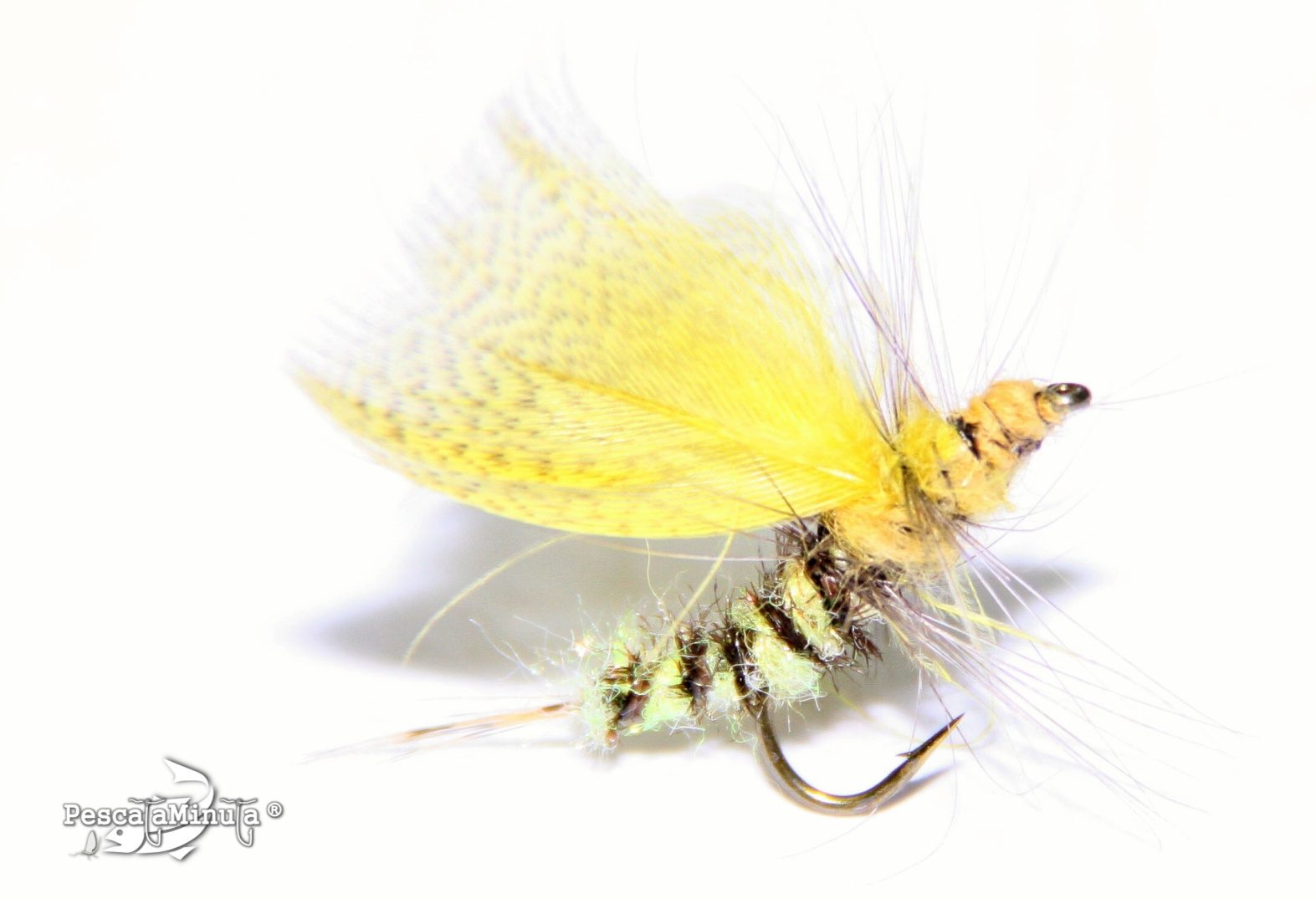 Patas: paracaídas invertido de pluma de gallo teñida en amarillo y moteada en negro
