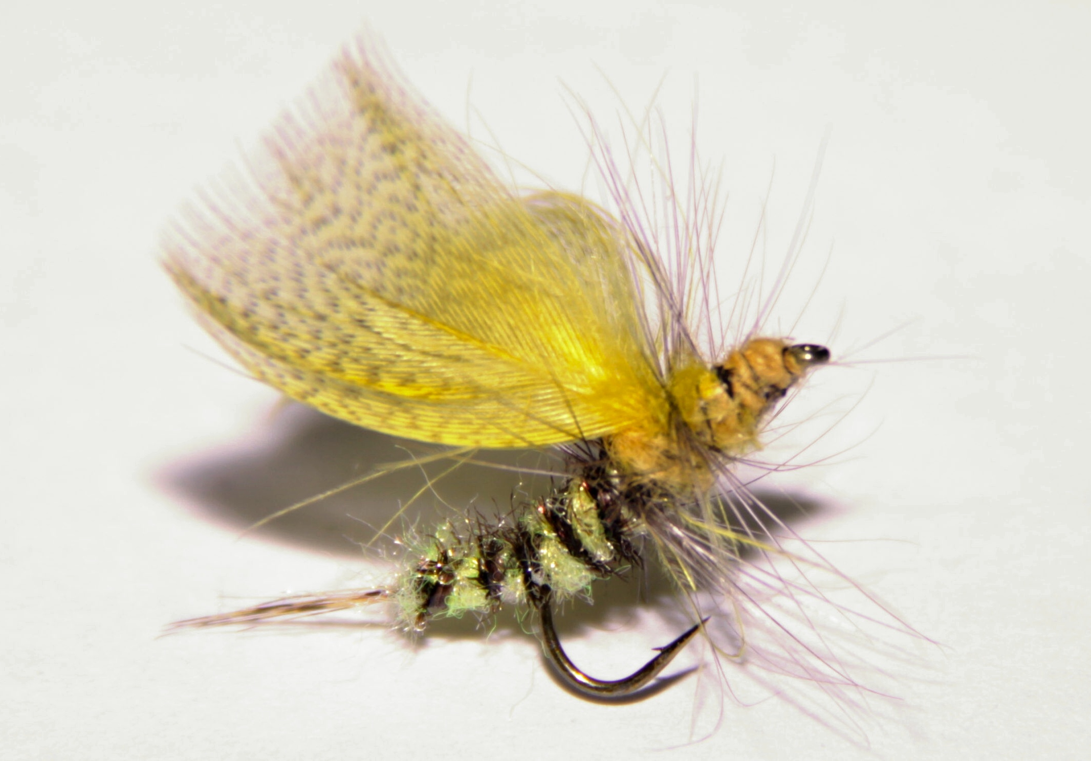 Cuerpo: Extendido en su primera parte, formado por dubbing de antrón amarillo brincado con quill de pavo real teñido con ácido pícrico