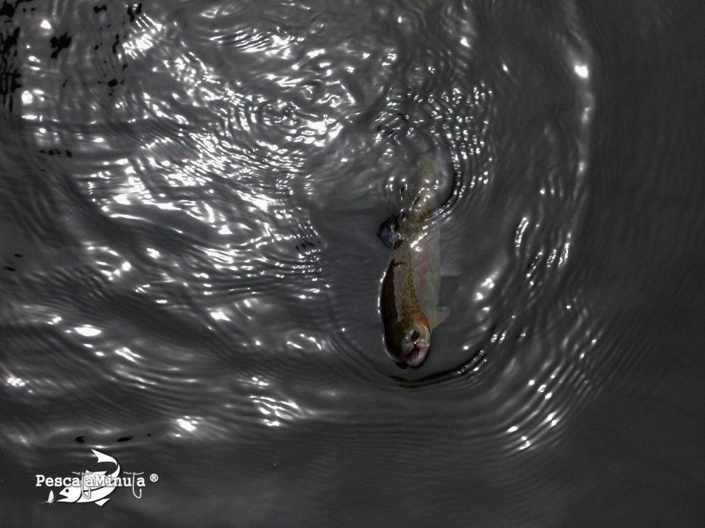 Y continuamos remontando el tramo, poza a poza y tabla a tabla en busca de algún otro ejemplar. Sería en una tabla hacia la parte central del tramo cuando otra arcoíris se clava en un perdigón y por fin soy capaz de capturar. Cuando acto seguido otro ejemplar de mediano tamaño vuelve a ser engañado. Cambio de tabla y en uno de los cortados vuelvo a probar fortuna y clavo otra arcoíris y una fario alevín. Parecía que por la hora que era cerca del medio día, las temperaturas provocaban una mayor actividad y la suerte nos empezaba a sonreír.