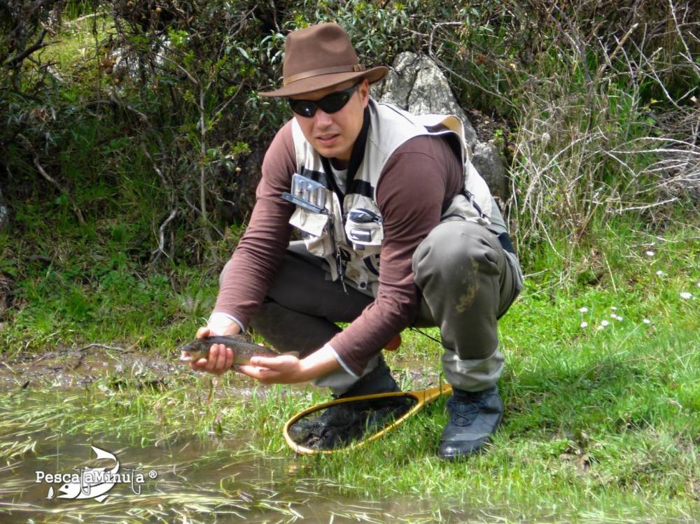 Al poco tiempo Miguel clavó una hermosa trucha, grandísima, pero peleona. Pero igual, cuando se preparaba para coger la sacadera la trucha se soltó. Una pena! era un bonito ejemplar. Es lo que tiene usar anzuelos sin muerte, tienes que tener la captura más tiempo en tensión y es más difícil cobrarla.