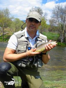 otra trucha fario con una ninfa CD, pero la mala suerte le hace perderla antes de dar testimonio. Por mi parte y pocos minutos después en un remanso de la corriente, clavo otra trucha común de buen tamaño también con ninfa CD, por lo que parecía que la actividad se animaba. El cielo se abría y el sol asomaba calentando el ambiente.