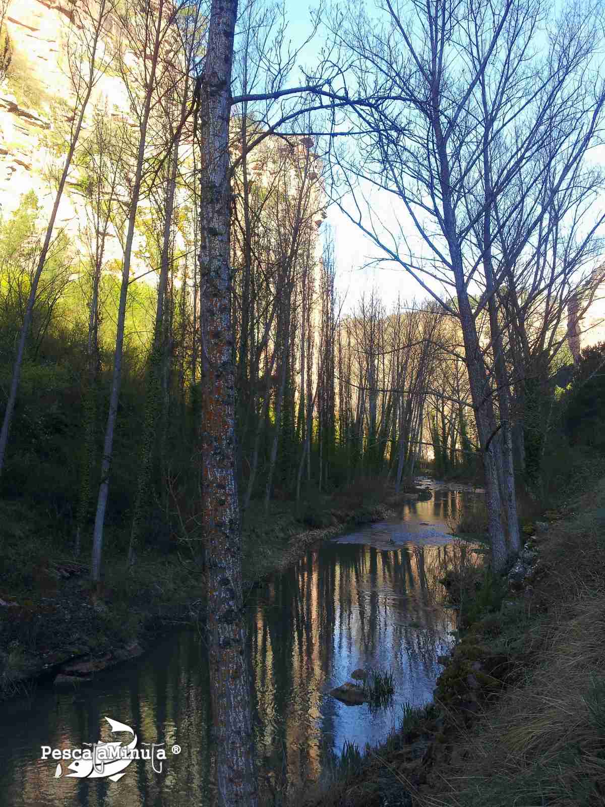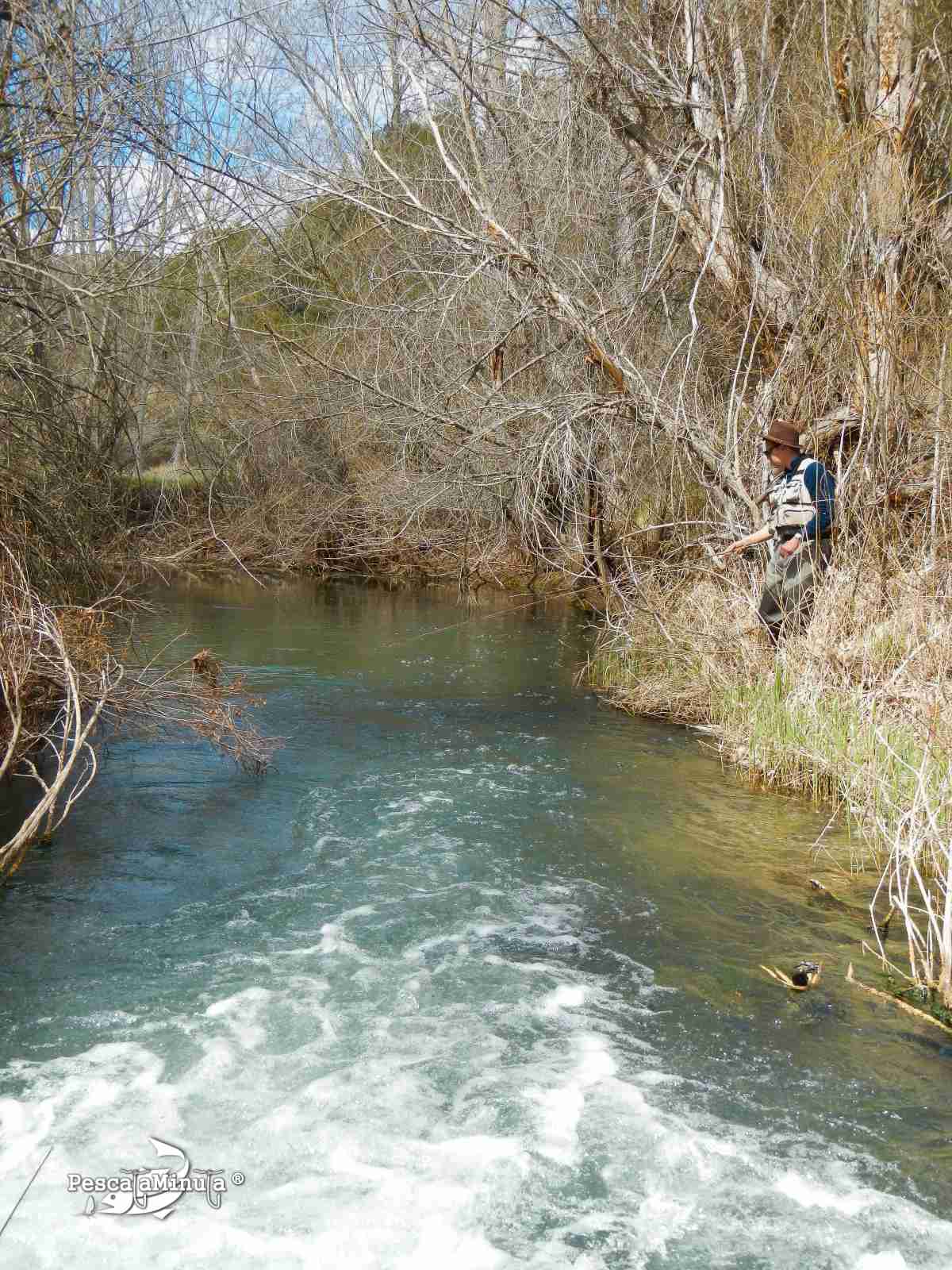 El día amaneció de camino totalmente despejado, lo cual después de varios días de viento, lluvia y granizo, era todo un respiro. Según nos acercábamos al tramos, advertimos el caudal de sus aguas, muy tomadas y algo turbias, precisamente por las últimas tormentas. Aun así se veían muchas tablas pescables que a buen seguro nos depararían algunas que otra sorpresa.