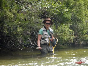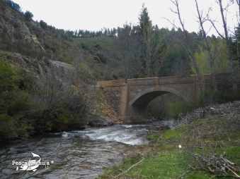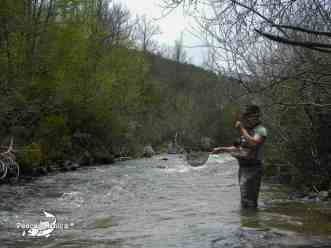 Iniciamos nuestra jornada de pesca subiendo río arriba desde el puente que lo atraviesa por la pista forestal, que más o menos puede ser la mitad del coto. Ya desde el principio se ven algunas pozas con cierta profundidad que terminan en rápidos y que son idóneos para tentar a las pintonas con las ninfas. Damos los primeros lances y poco después llego a pinchar la primera trucha, que no logro clavar bien, pero que veo que se trata de un pequeño ejemplar y que finalmente tras mi insistencia, después de unos lances más consigo capturar.