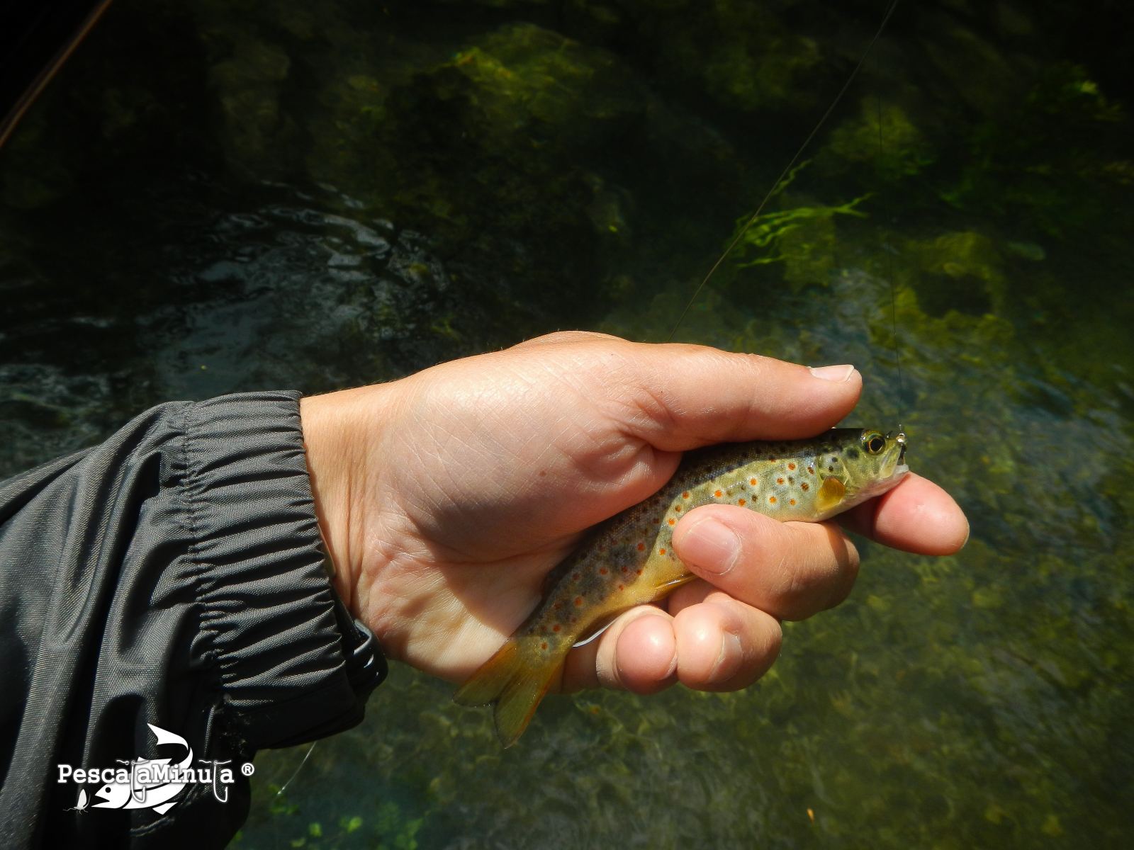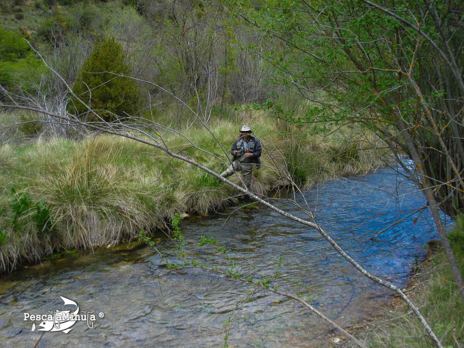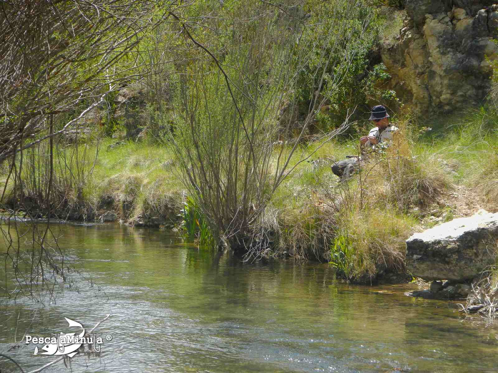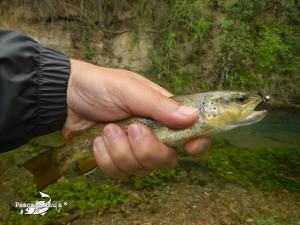 Comenzamos a pescar en la cabecera del coto y en los primeros acercamientos a las orillas del río, se pueden observar gracias a la transparencia del agua, muchas truchas que rápidamente se esconden al detectar nuestra ingrata presencia. Damos los primeros pasos y en el primer meandro pronto clavo la primera pintona, un bonito pez de medio tamaño con una librea algo oscura.