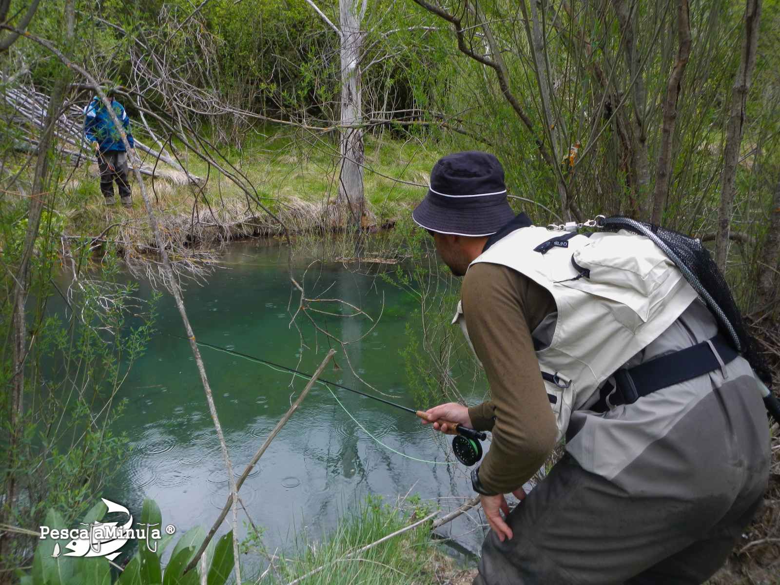 Llegamos al río temprano pues las predicciones meteorológicas apuntaban a que podríamos pescar con tranquilidad hasta el medio día y para entonces se podrían producir importantes tormentas en la zona. Con la intención de aprovechar la mañana nos apuramos en preparar equipos a pie de rio para comenzar cuanto antes, llevando consigo los chubasqueros por si las predicciones se adelantaban.