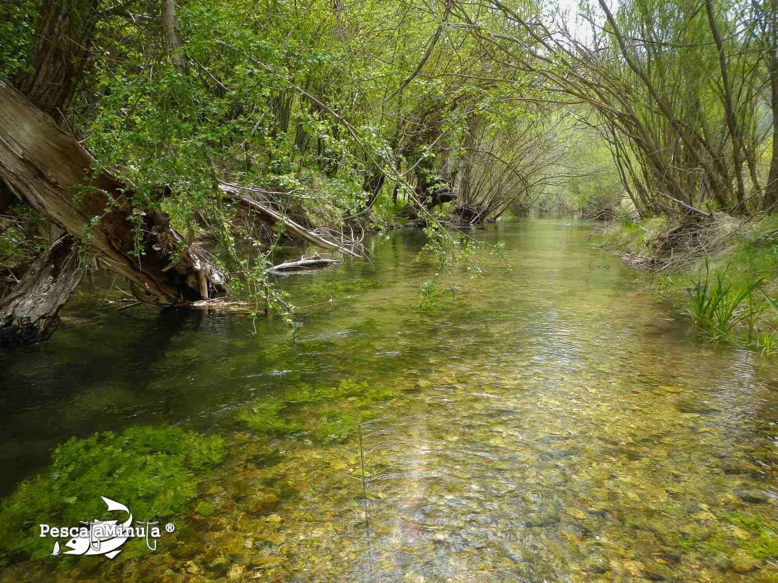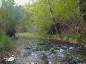 Los primeros metros del tramo son muy someros, tan sólo se ven ciertas posturas con algo de profundidad que pueden albergar truchas bajo algunas raíces de árboles pegados a la orillas y donde se van escondiendo los peces cuando no guardamos el suficiente sigilo. Precisamente es la gran dificultad que ofrece este coto, el no ser detectado al aproximarse a sus orillas para intentar pescarlo.