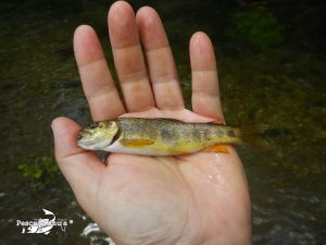 Santi había tomado la delantera recorriendo el tramo y nos aventajaba unos 150 ó 200 metros aguas abajo. Por mi parte iba cerrando la expedición, escudriñando cada rincón que se ponía a tiro, con algo más de paciencia. Cuando llegamos a pequeño salto que se produce en el tramo y que termina en una rompiente con una poza muy interesante, consigo clavar otra pequeña trucha que no resiste la tentación de picar a una ninfa de bétido con cabeza dorada.