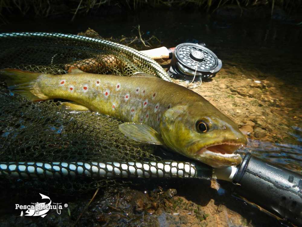 raíces de las orillas. Alguna se deja ver, asustada al notar cerca nuestra presencia. Es en una de esas tablas y entre el “canalillo” que forma el agua entre la vegetación y la orilla del río, justo donde más sombra hay, donde consigo clavar una hermosa trucha de 39cm con una ninfa de bétido. ¡Genial! La espera mereció la pena, pues el ejemplar es de una bravura extraordinaria y una vez capturada muestra un magnífico aspecto. Cien metros más arriba Miguel había encontrado un filón en la cascada de una poza de profundidad, donde en