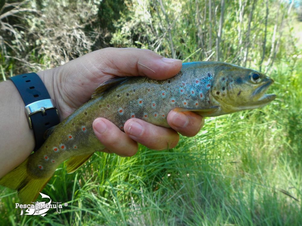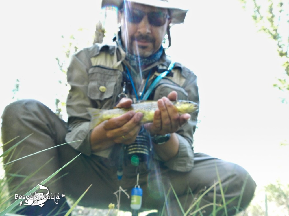 Me enseña el tramo donde sacó las dos truchas (de buen tamaño por cierto), en una zona donde el rio se divide en dos partes, y de rodillas, casi reptando me acerco a la orilla y “suelto” mi tricóptero sin tocar casi con el bajo en el agua, tras dos rechazos y una cebada fallida consigo capturar la primera trucha. ¡Por fin!