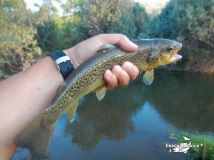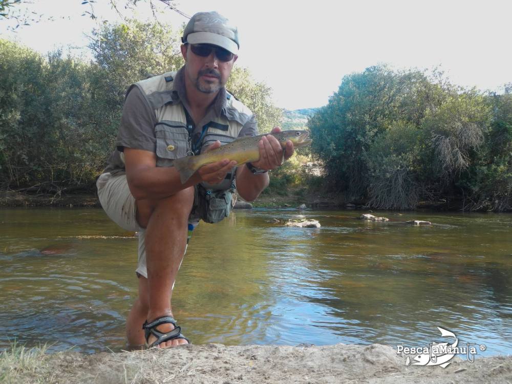 Rápidamente preparo equipo y moscas, eligiendo precisamente una imitación de hormiga de alas para empezar y pronto la primera trucha sucumbe a la imitación. Otras capturas se van sucediendo hasta que una de ellas de gran tamaño rompe el bajo y me hace cambiarlo y su vez de mosca.