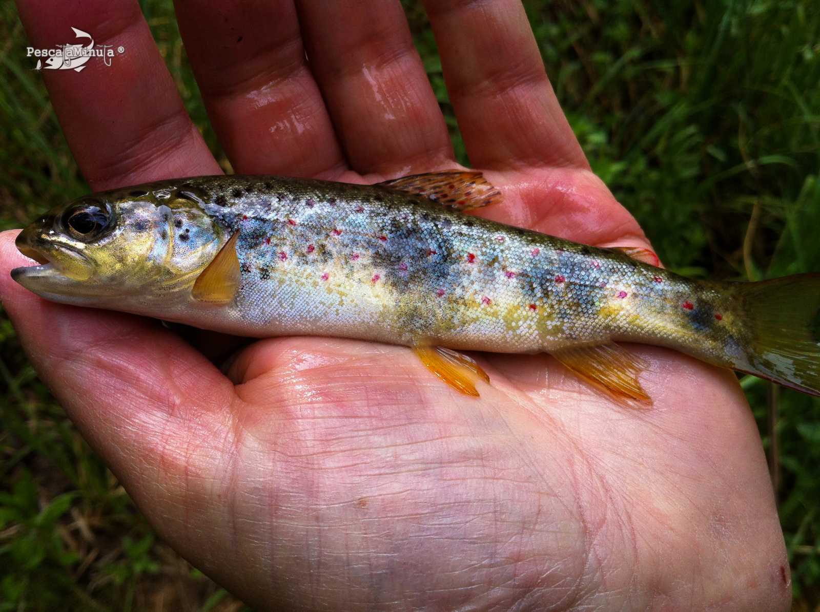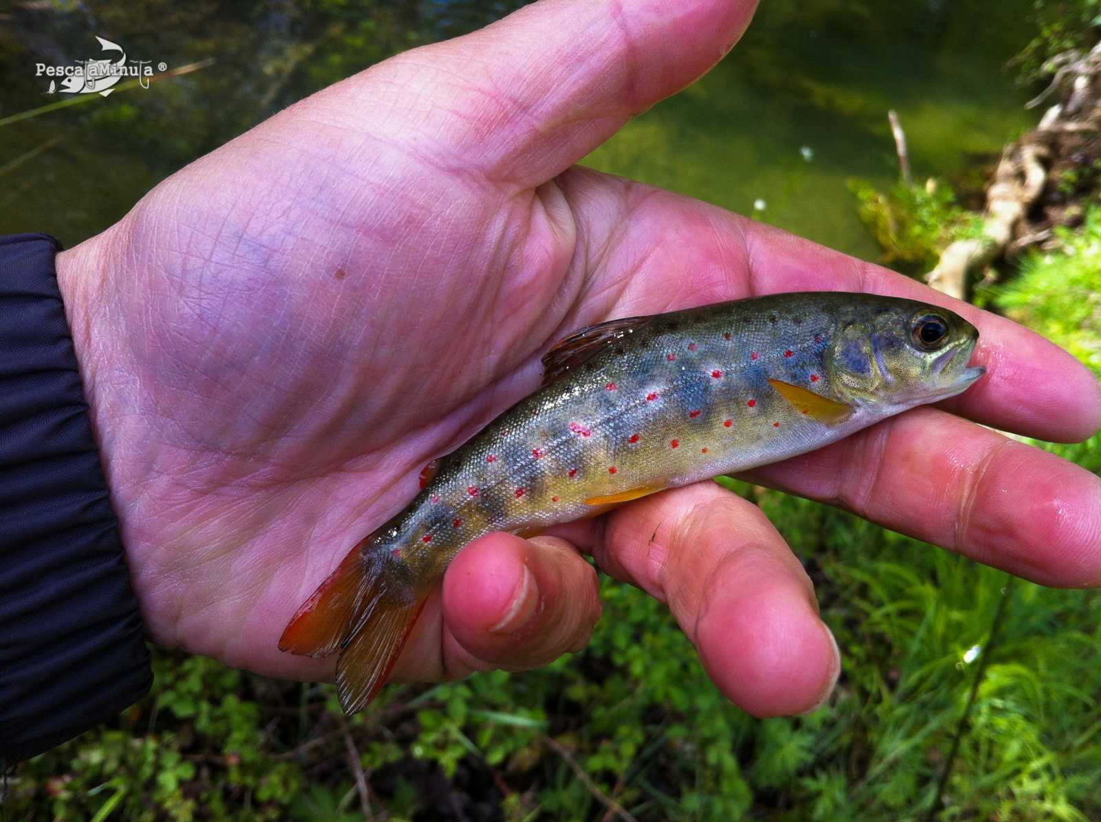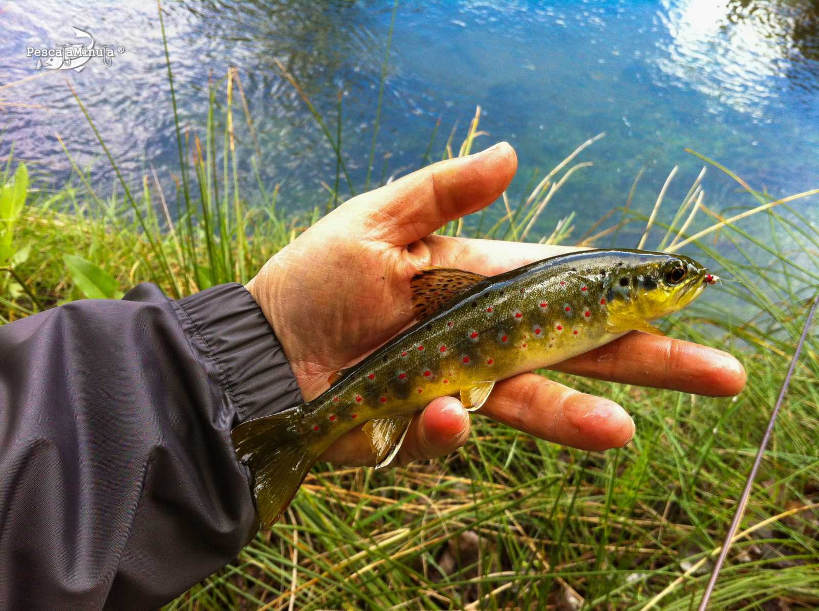 fallida, de alguna truchita demasiado pequeña, que no se clava bien en el anzuelo. Las capturas se van alternando, con algún ejemplar mediano y otras muchas pequeñas, que atacan a la mosca al poco de discurrir por el fondo.