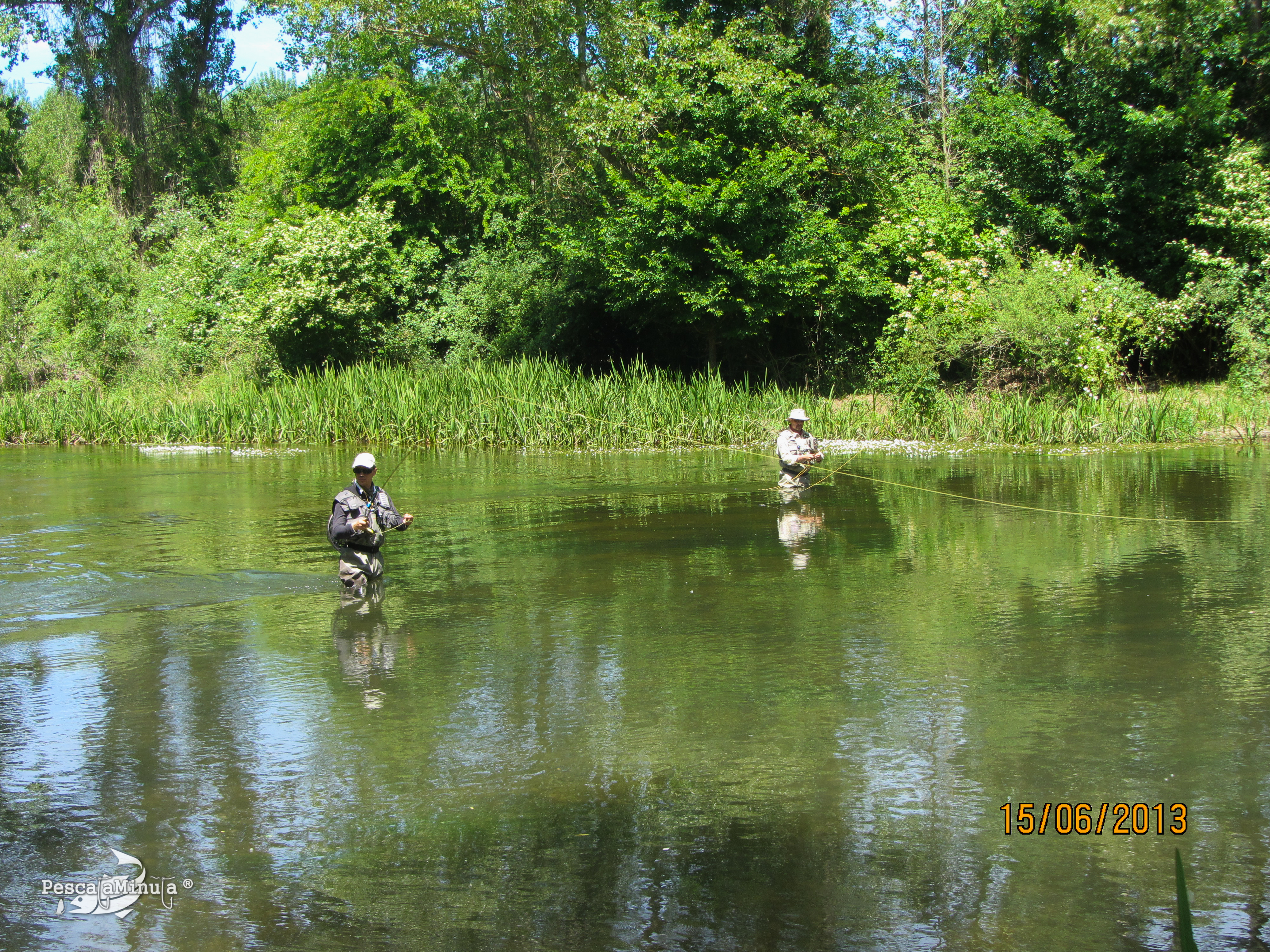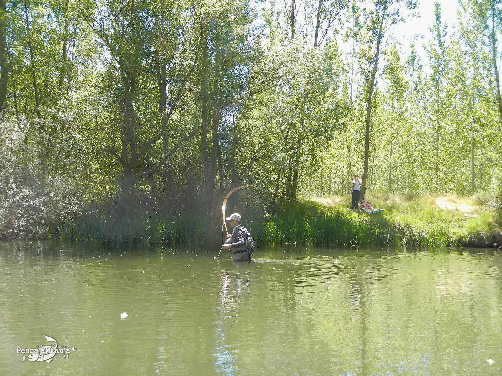 El Condado II 2013 (11)Seguimos avanzando y nos encontramos con corrientes y aguas algo más someras, donde cambiamos nuestras imitaciones por ninfas con las que poder mover alguna trucha cautelosa entre la vegetación subacuática. Sabiendo el riesgo que corrían los bajos con tal cobertura en el lecho, habría que manejar muy bien las derivas evitando los posibles enganches en las ocas.
