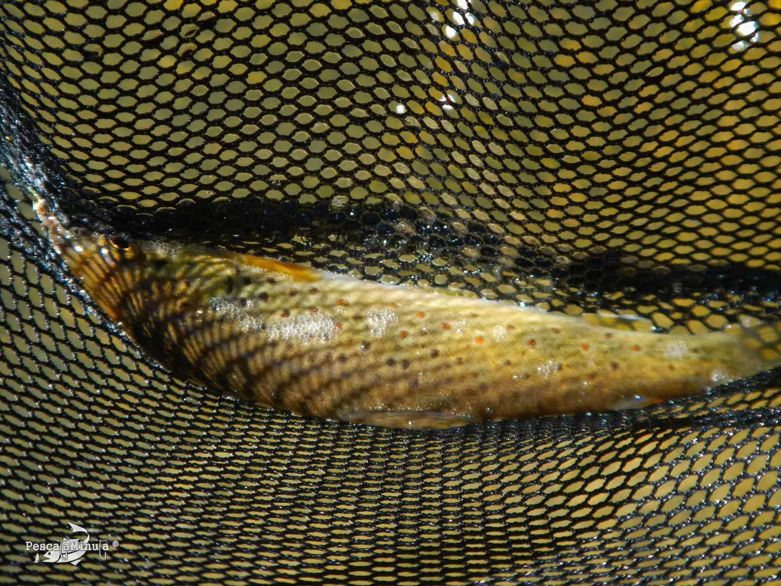 La curva que precedía a estas corrientes volcaba todas sus aguas hacia la orilla izquierda por lo que la fuerza de las mismas impedía avanzar bien y tener equilibrio en las posturas que nos encontrábamos. Pero había que intentarlo, se daban las circunstancias que hacían pensar que allí abría truchas. Y así fue pronto una preciosa trucha tomó el perdigón CD que acaba de montar, de la que no puede dejar testimonio gráfico porque se me escurrió cuando justo preparaba su toma. Minutos después y unos metros más arriba, tengo otra picada pero no logro clavarla bien.