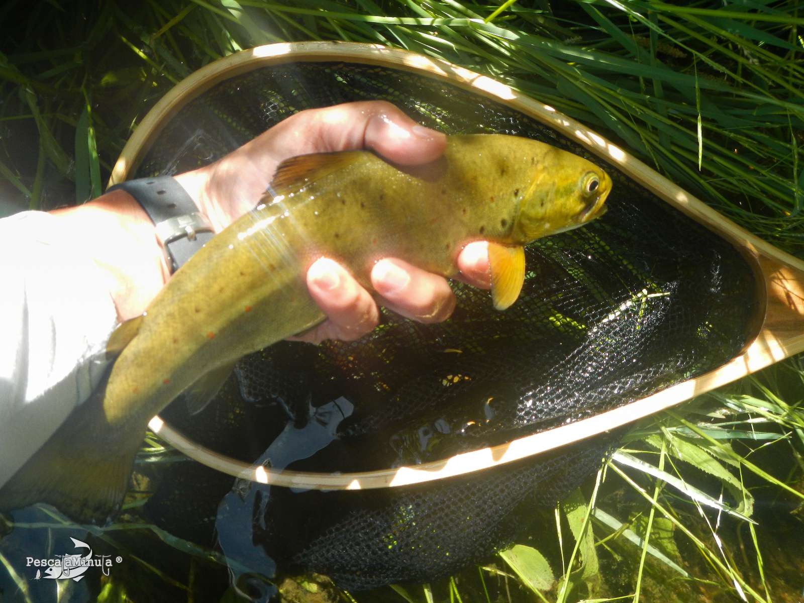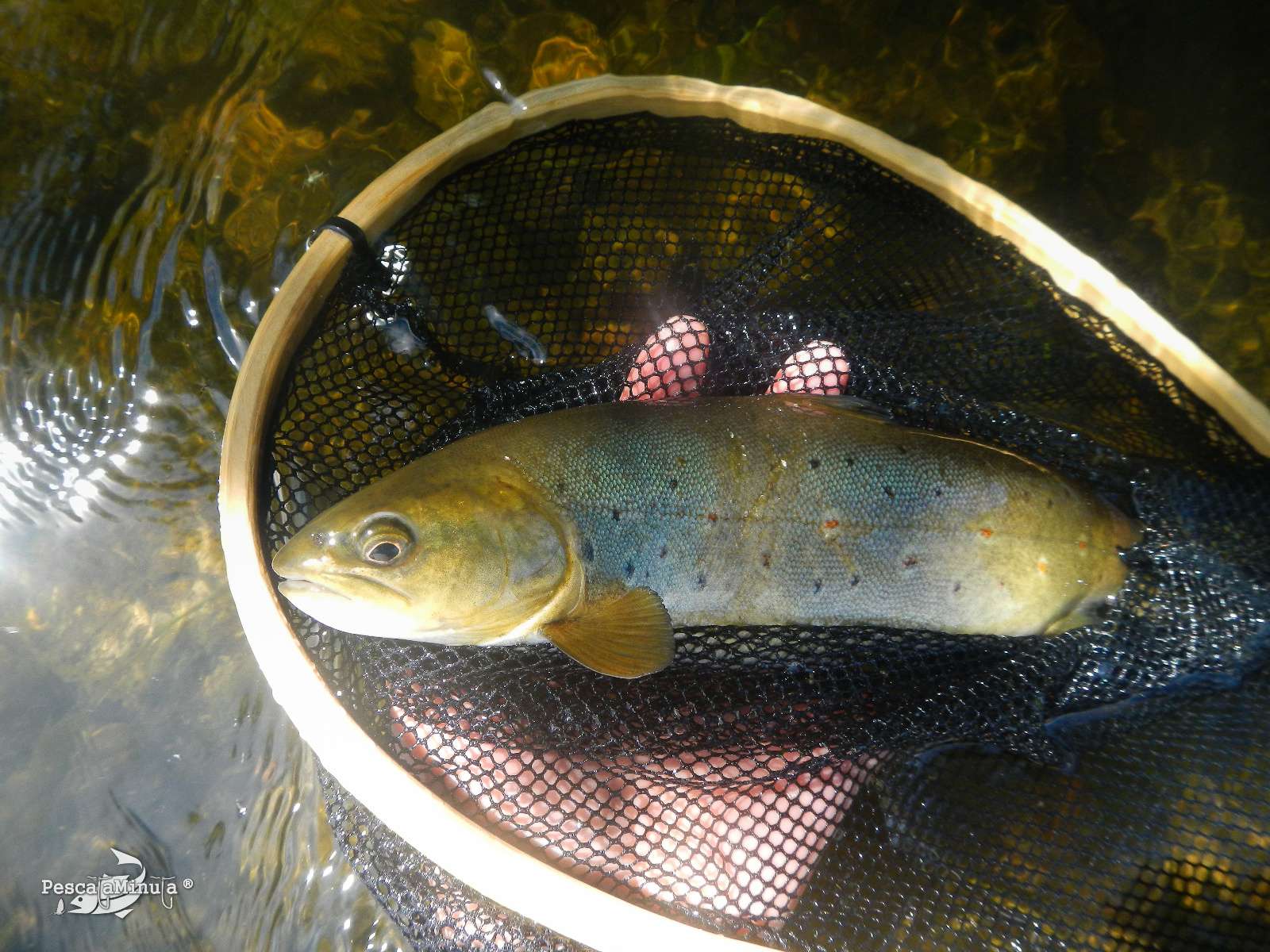 Observando desde una orilla todo el tablón del tramo inferior, se distinguían cebadas intermitentes de algunas truchitas, algunas se dejaban ver completamente en sus saltos, pero no eran muy frecuentes. Hacia la mitad de la misma, me dispuse a cruzar para situarme junto a la orilla contraria donde se distinguía más actividad bajo las coberturas de los árboles y comencé a realizar los primeros lances. A los pocos minutos ya tenía 2 truchitas, que entraron al tricóptero de GDL. Pero no estaba conforme, parecía que allí eran todas de la misma talla, por lo que pronto me dispuse a subir cerca de la isla que hay en la zona superior de dicha tabla.