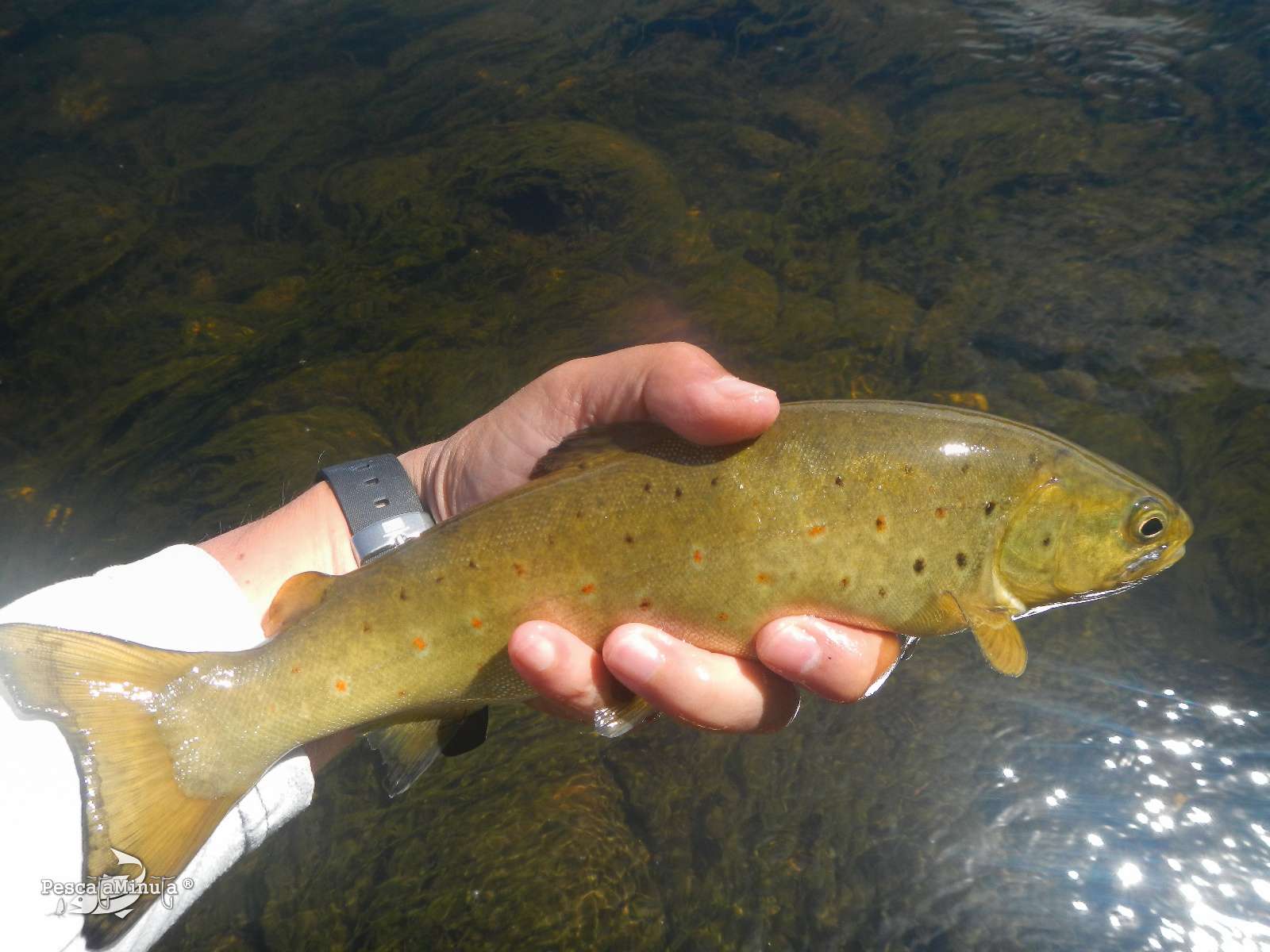 En esta zona, más de lo mismo, aunque menos actividad hacia las 12h, pero las truchas no subían de talla. Había clavado otra de unos 24cm con el mismo tricóptero rojizo de riñonada. Este tramo inferior lo había pescado algo rápido, sin entretenerme demasiado como hago otras veces, pues mi obsesión en localizar alguna trucha grande me hacía no malgastar el tiempo en cada postura. Subí por encima de los chorros y corrientes pegadas a la caseta, para ponerme en la tablona ancha que hay aguas arriba. Aquí parecía que no había peces, quizás el calor y las horas centrales del día harían que se animase un poco la zona, pero tuve que avanzar bastantes metros hasta que se pude ver truchas comer arriba. Esta vez, me pillaban a favor de mi margen y enseguida tenía otras dos capturas casi seguidas de pequeña talla, pero ambas muy bonitas.