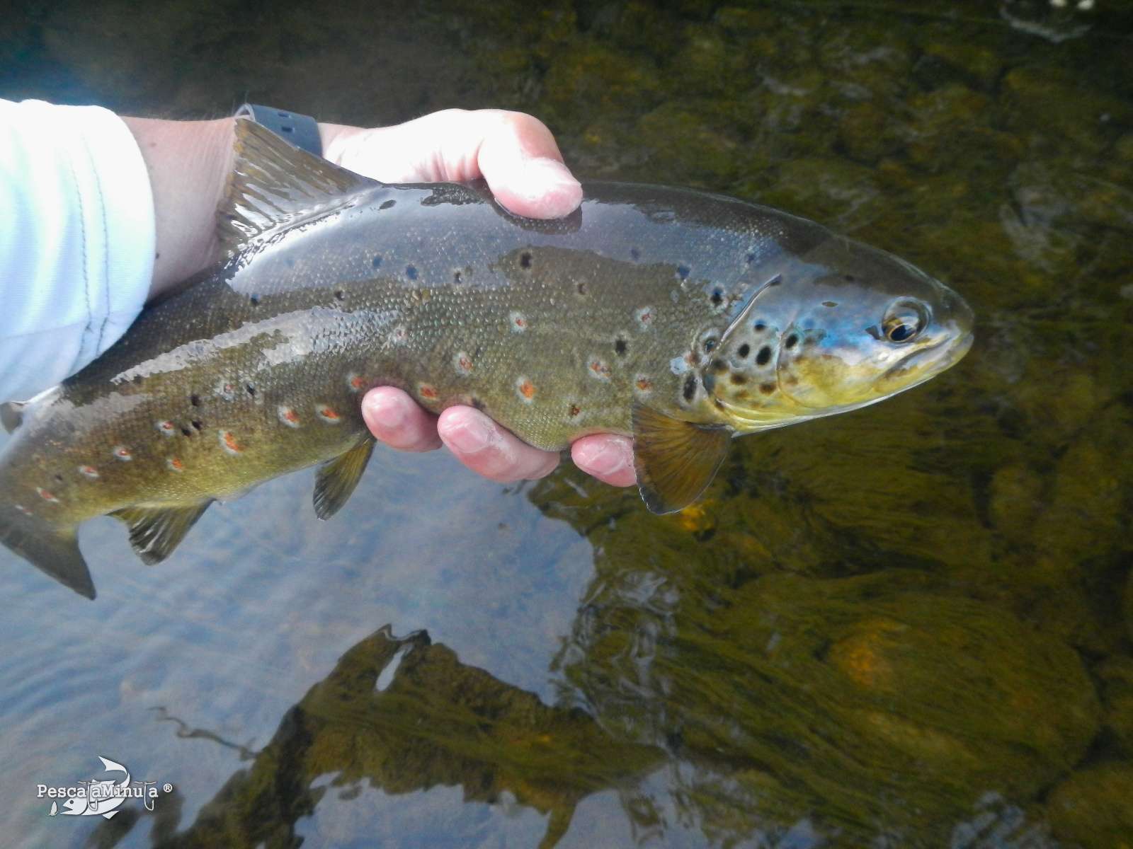 Me estaba entreteniendo mucho, no paraban de cebarse a mi alrededor y no se resistían al tricóptero, aunque alguna parada tenía que hacer para arreglar el bajo cuando rompían y perdía las moscas. Con todo ello no me percataba de algunas cebadas que se venían sucediendo unos metros aguas arriba a mi derecha. En una de las que estoy preparando la mosca, me quedo mirando y contemplo como se trata de una trucha enorme, que a priori supera los 50cm. Estaba casi en la superficie y dejaba ver su aleta caudal de vez en cuando. Primero pensé que se trataba de un barbo, pero sus continuas cebadas me permitieron contemplarla completamente y con nitidez. Era un hermoso macho de más de 60cm que se estaba alimentando de alguna pequeña mosca, entre tanta eclosión como había en ese preciso momento. Algunas veces hasta retrocedía de su posición y perseguía a la mosca para darla caza y luego volvía a su posición. Era preciosa y era mi oportunidad para intentar lograr una gran trucha!