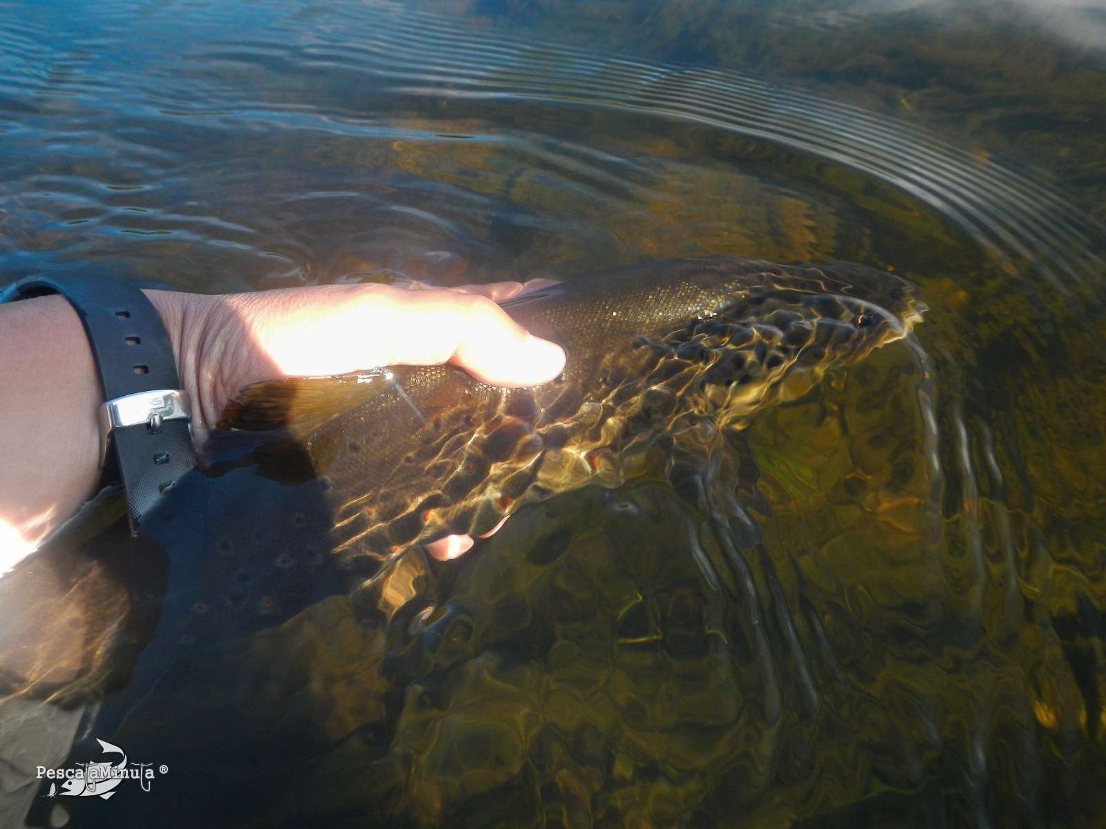 Era una magnífica escena, las truchas se cebaban por todos los sitios y no lo podía desaprovechar ni un segundo. En los primeros lances ya había conseguido tres truchas, una de ellas ya pasaba de los 30 cm, la cual me dio un poco de pelea al meterse entre la vegetación. Luego se me escaparon otras dos más, entre las ocas. Había que clavarlas y mantenerlas arriba rápidamente, ya que de lo contrario se iban abajo y se enredaban hasta que se soltaban o partían el terminal.