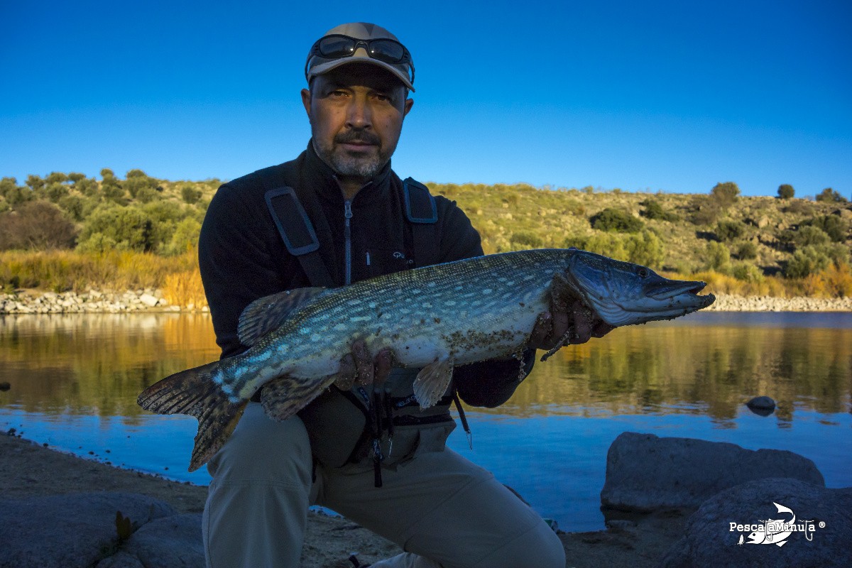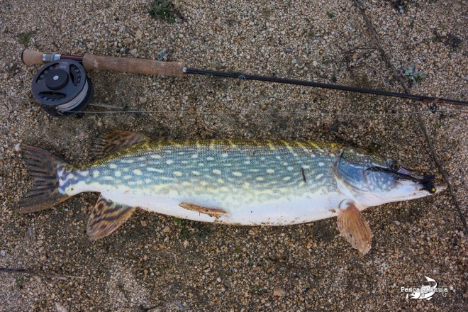 Fresco y soleado día para salir de pesca. Hoy de esócidos. El primero logró escaparse en la misma orilla, pero el segundo posó como trofeo para luego ser soltado. Un streamer de cola de conejo negro resultó eficaz.
