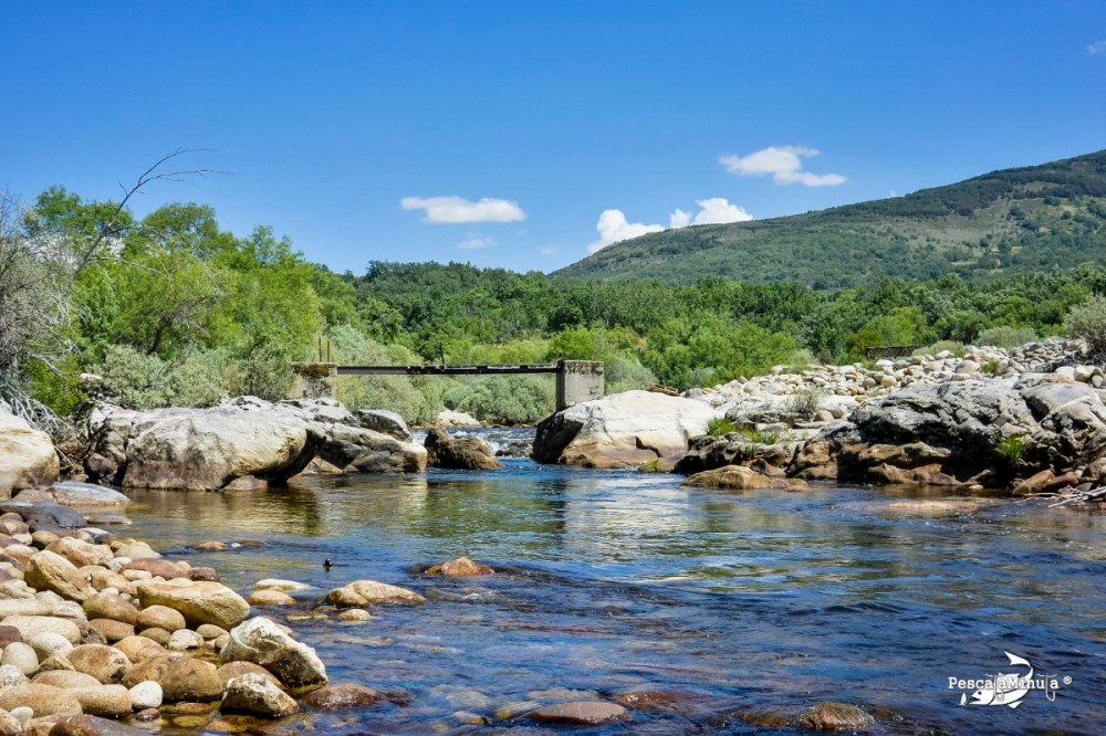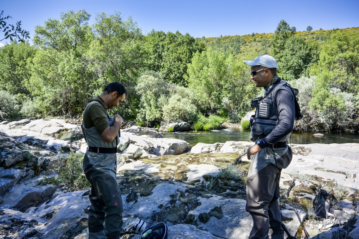 Nada más llegar un pescador aguardaba a su compañero sentado en el borde del puente del límite inferior. Le saludamos y preguntamos por la situación y su respuesta no nos gustó nada, -¡el río baja como chocolate!- nos comenta, por lo que nos asomamos para analizar las posibilidades que teníamos. Tras recorrer los primeros 200 metros, estábamos dispuestos a intentarlo pese a lo oscura y tomada que bajaba el agua, pero por suerte para nosotros cuando nos estábamos terminando de poner los waders llegó el guarda y según nos pedía los permisos aprovechamos para preguntarle por otras zonas de pesca. Nos dijo que desde Navalperal venía el agua igual pero que podía preguntar a su compañero. Y así lo hizo, delante de nosotros amablemente llamó a su compañero que se encontraba por la zona de El Barco de Ávila para pedirle información que como bajaba el agua. Nuestras semblantes cambiaron rápidamente cuando nos confirma que por esa zona el río baja limpio. Visto lo visto y sin perder más tiempo con los equipos puestos, recogemos y nos apresuramos para pescar al LSM del Tormes aguas abajo.