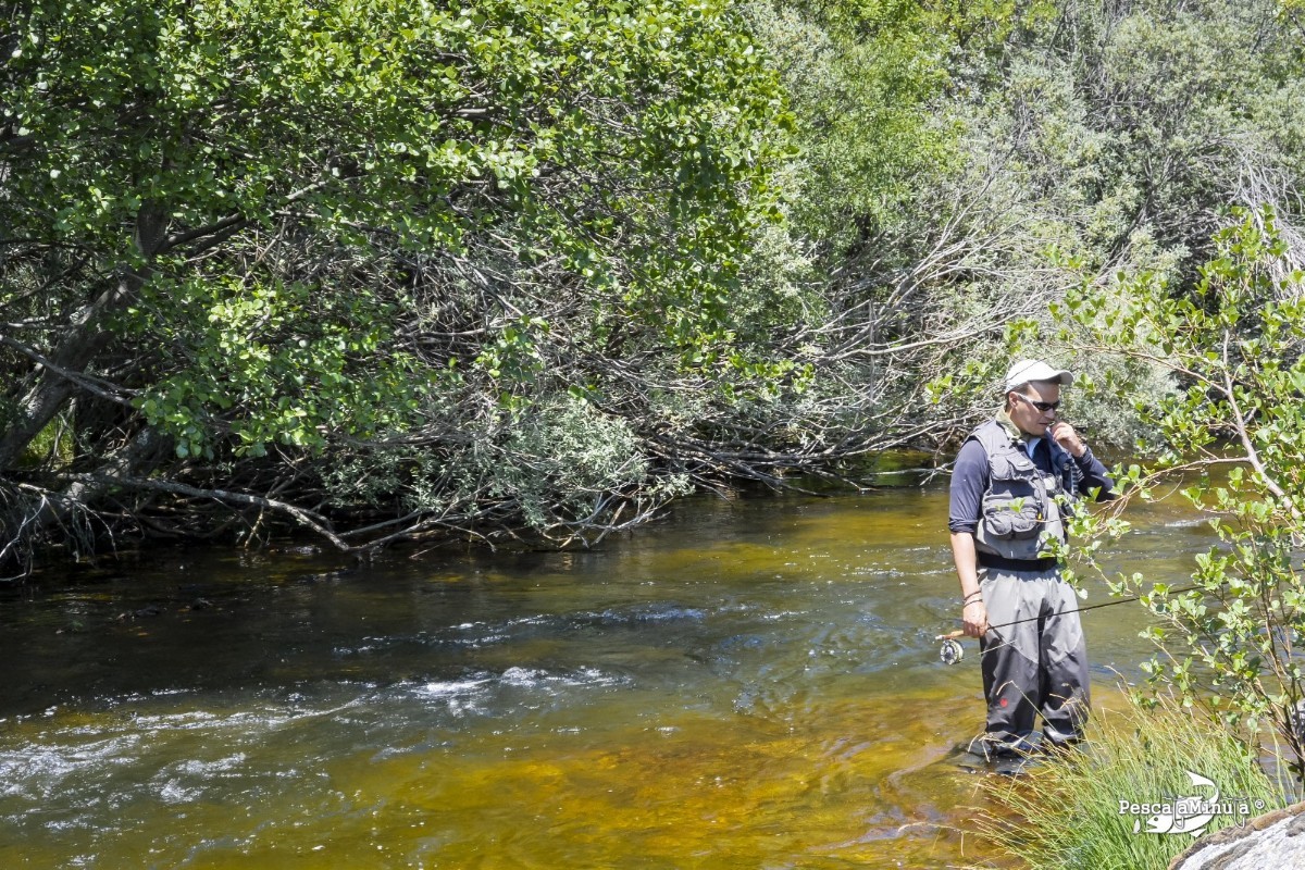 Nos adentramos en el agua y comenzamos a ver peces, bogas, grandes barbos y un par de truchas de una talla superior a los 45 cm, en uno de los pozos. Pero éstas no querían saber nada de todo lo que se pasaba por delante, se mantenían impasibles y como mucho alguna se giraba revisando la mosca un instante y nada más.