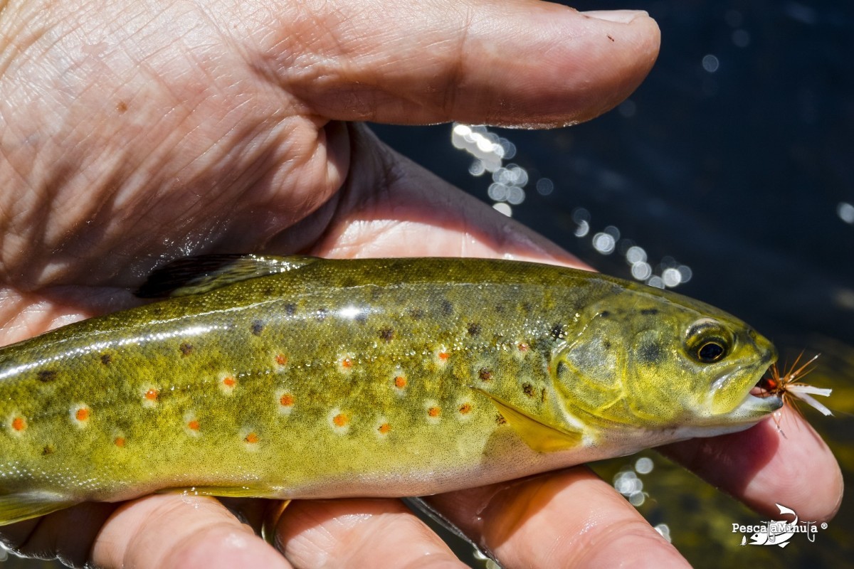 200 metros más arriba, entre corrientes y remansos avisto una cebada que se repite varias veces. Poco después consigo clavar la primera de la mañana y como la postura invitaba a tentar a alguna más, seguí lanzando la mosca por la chorerra sutilmente y en otro de los lances clavo una segunda trucha. Antes de abandonar el sitio una boga sucumbe al engaño.