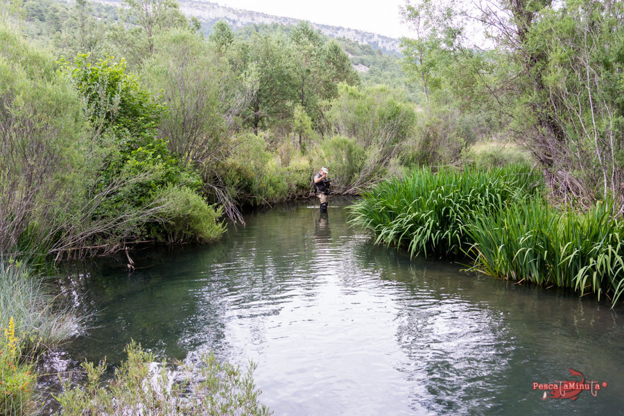 Durante esta primera hora, son constantes los encuentros con los barbos y bogas que van apareciendo durante el vadeo sigiloso que exige el río. También tenemos a tiro algunos ejemplares de trucha de 40cm, pero sabias como ninguna, de las que no podemos contar más, simplemente que estaban ahí. Su astucia nos pone a prueba y no logramos engañar a ninguna de que nos encontramos.