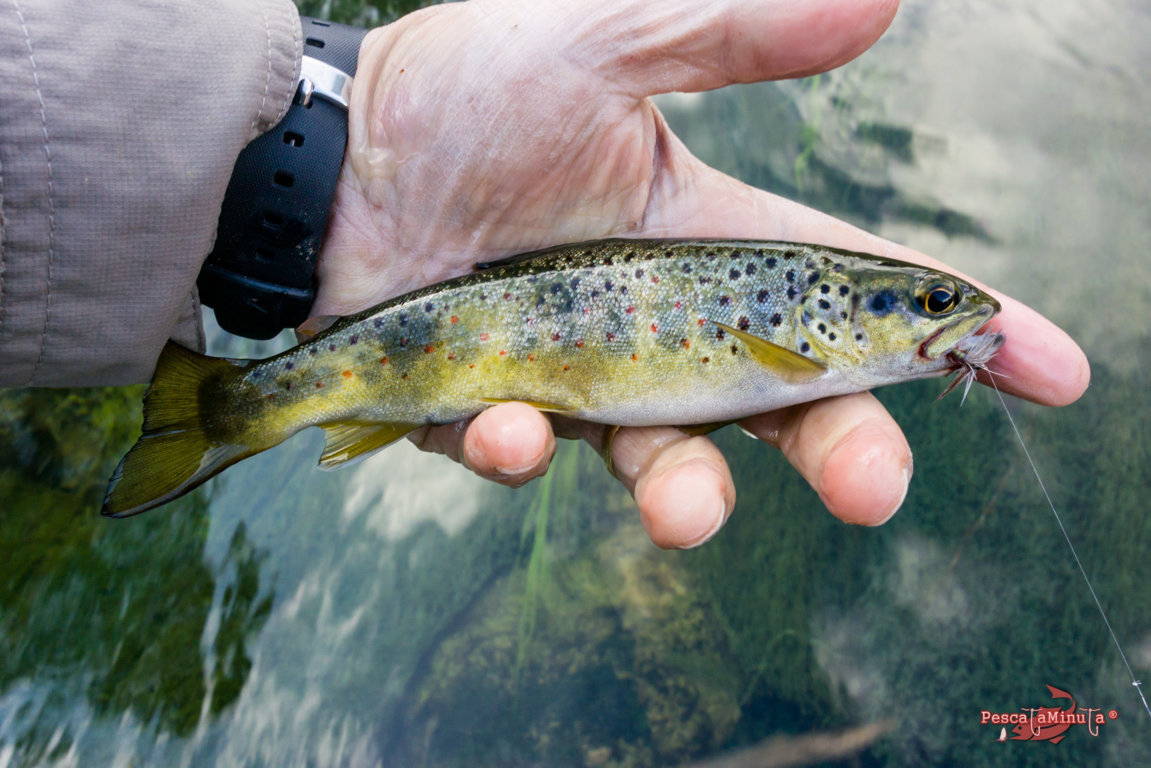 En el camino de bajada, nos deteníamos en alguna zona querenciosa que Manolo conocía y las primeras capturas no se hacen esperar y en la primera postura, consigo clavar un par de peces a ninfa. Pequeñas, nada del otro mundo, pero preciosas como esperaba. Manolo por su parte, pescando al agua, consigue hacer subir una a superficie, pero no logra clavarla.