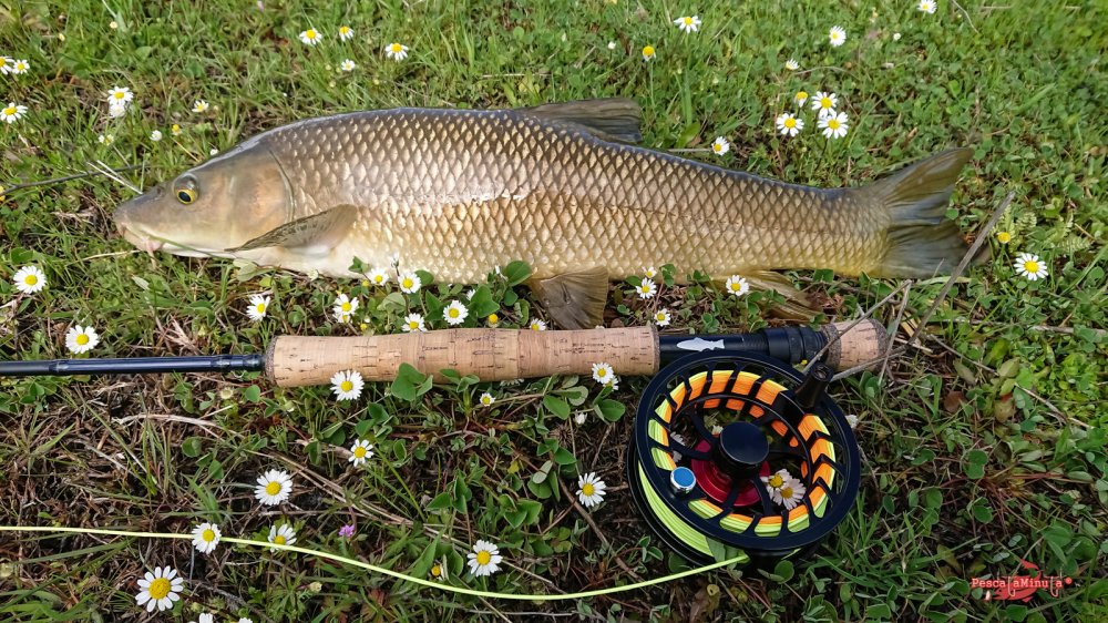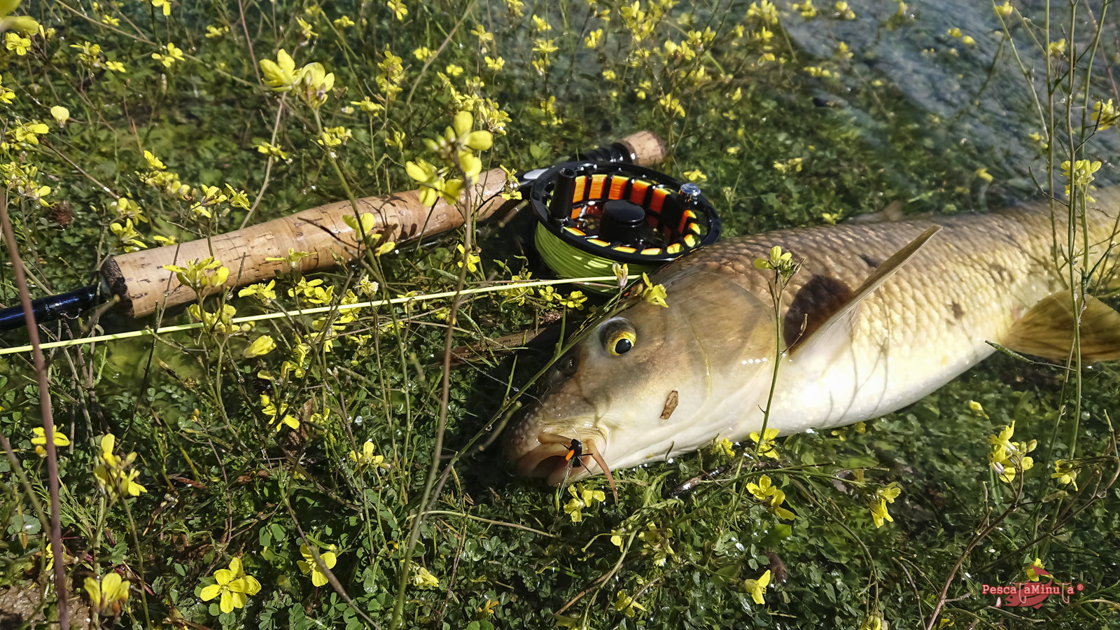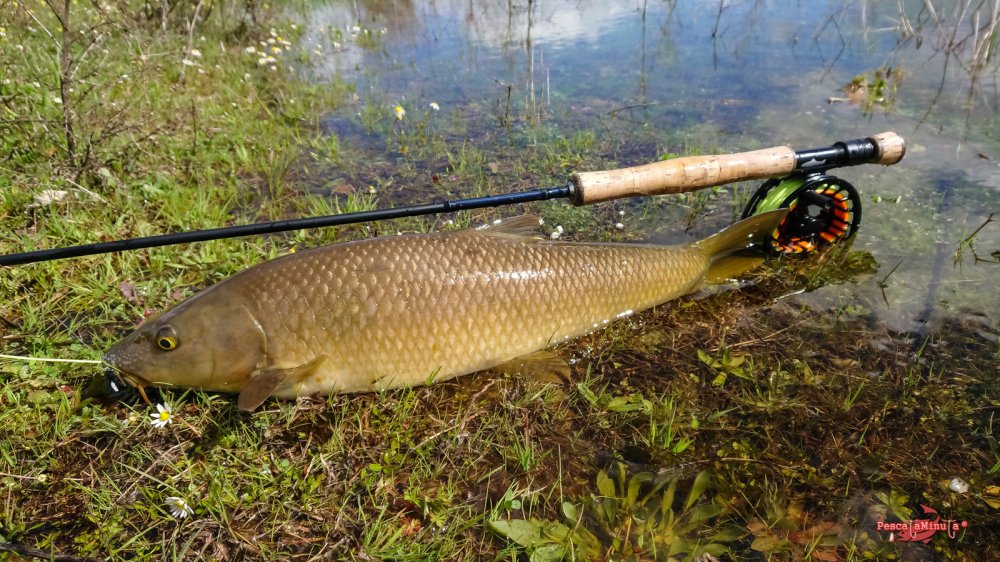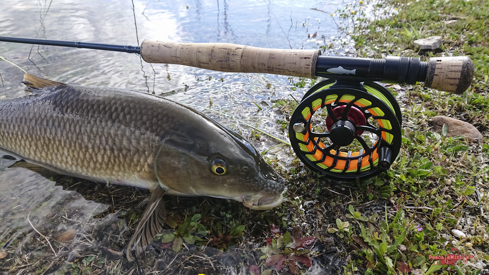 Poco a poco recorro con cautela las reculas en dirección a una zona más protegida del viento, donde se pueda distinguir mejor cualquier movimiento. Antes de llegar veo la insinuante estela de un barbo nadando paralelo a la orilla. ¡Es el momento! Sin dar un paso más, saco línea para hacer un lance de unos diez metros y situar la mosca por delante en su misma dirección. El barbo no se lo piensa y toma la mosca con glotonería, pero a partir de aquí el coletazo de salida para su frenética carrera es espectacular, sin ser un pez excesivamente grande.