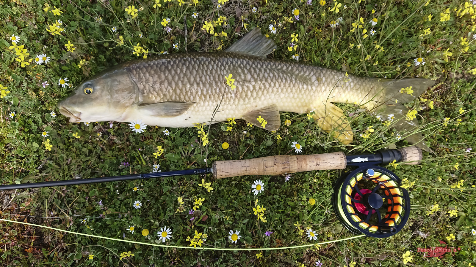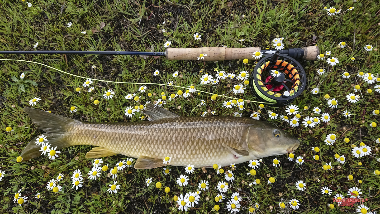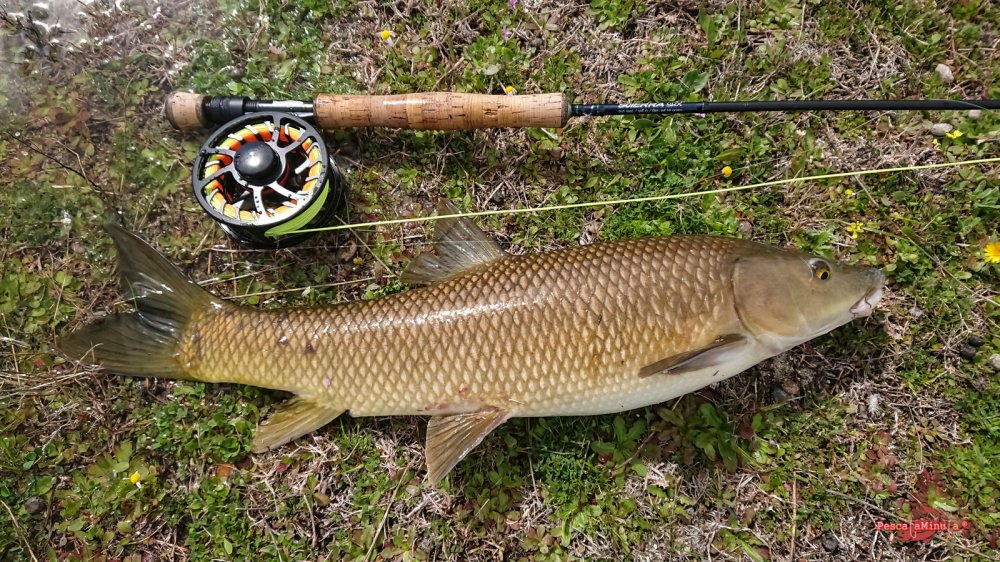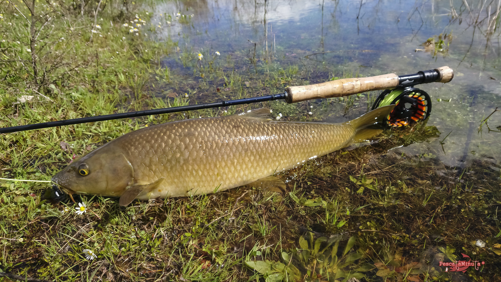 Poco a poco recorro con cautela las reculas en dirección a una zona más protegida del viento, donde se pueda distinguir mejor cualquier movimiento. Antes de llegar veo la insinuante estela de un barbo nadando paralelo a la orilla. ¡Es el momento! Sin dar un paso más, saco línea para hacer un lance de unos diez metros y situar la mosca por delante en su misma dirección. El barbo no se lo piensa y toma la mosca con glotonería, pero a partir de aquí el coletazo de salida para su frenética carrera es espectacular, sin ser un pez excesivamente grande.
