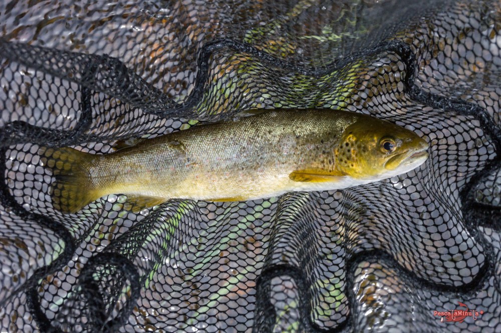 En efecto, primer lance y primera captura nada más comenzar a derivar, una trucha maja acepta el engaño y es llevada a la sacadera. Algo más grandecita que las anteriores. Durante un buen rato ese viento que agita las ramas de los árboles me ayuda a capturar tres ejemplares más, aunque hay que hacer muchas correcciones en el lance para precisar dónde poner la mosca, hasta que éste cesa. A partir de aquí la actividad arriba desaparece por completo y después de varios intentos y cientos de río intentándolo no hay fortuna.