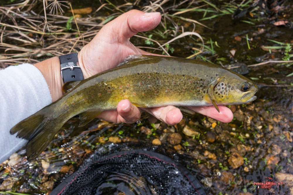 Reanudo la marcha, pero en lugar de subir por encima de donde lo dejé, lo hago por debajo, justo al pie de unas corrientes someras, unos 350 m aguas abajo. La sol cae de lado y a contraluz se ve mucho insecto volar, ignitas y tricópteros lo más abundantes, en cambio a penas se ven cebas de las truchas. Hay que intentarlo, aunque sea pescando al agua y probar suerte. Ato al terminal un tricóptero y me dejo llevar por el instinto para lanzarlo en las venas de las corrientes donde creo pueden estar. Después de varios minutos consigo levantar una trucha, que fallo por falta de concentración. A raíz de ese instante pongo los cinco sentido en conseguirlo, y poco después consigo otro bonito premio.