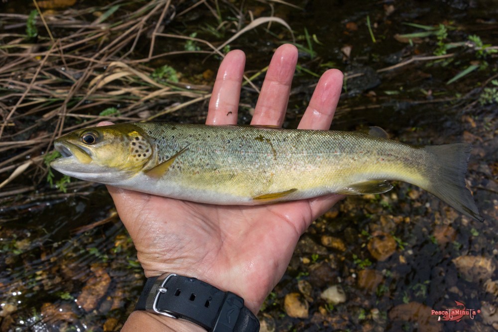Empiezo por atar un díptero oscuro en el terminal y a probar fortuna, no tardando en producirse la primera captura, que sin ser gran cosa, salta con fiereza para tratar de liberarse. Sin moverme de aquí, logro clavar otras dos más similares en tamaño. Se acumulan las señales en superficie incluso aguas abajo que trato de atajar lanzando en apilado para hacer una deriva lo más natural posible. Un par de fallos y otra trucha que cae en el engaño.