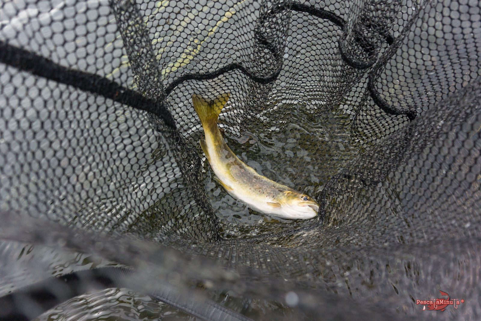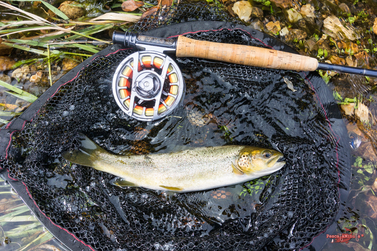 En efecto, primer lance y primera captura nada más comenzar a derivar, una trucha maja acepta el engaño y es llevada a la sacadera. Algo más grandecita que las anteriores. Durante un buen rato ese viento que agita las ramas de los árboles me ayuda a capturar tres ejemplares más, aunque hay que hacer muchas correcciones en el lance para precisar dónde poner la mosca, hasta que éste cesa. A partir de aquí la actividad arriba desaparece por completo y después de varios intentos y cientos de río intentándolo no hay fortuna.