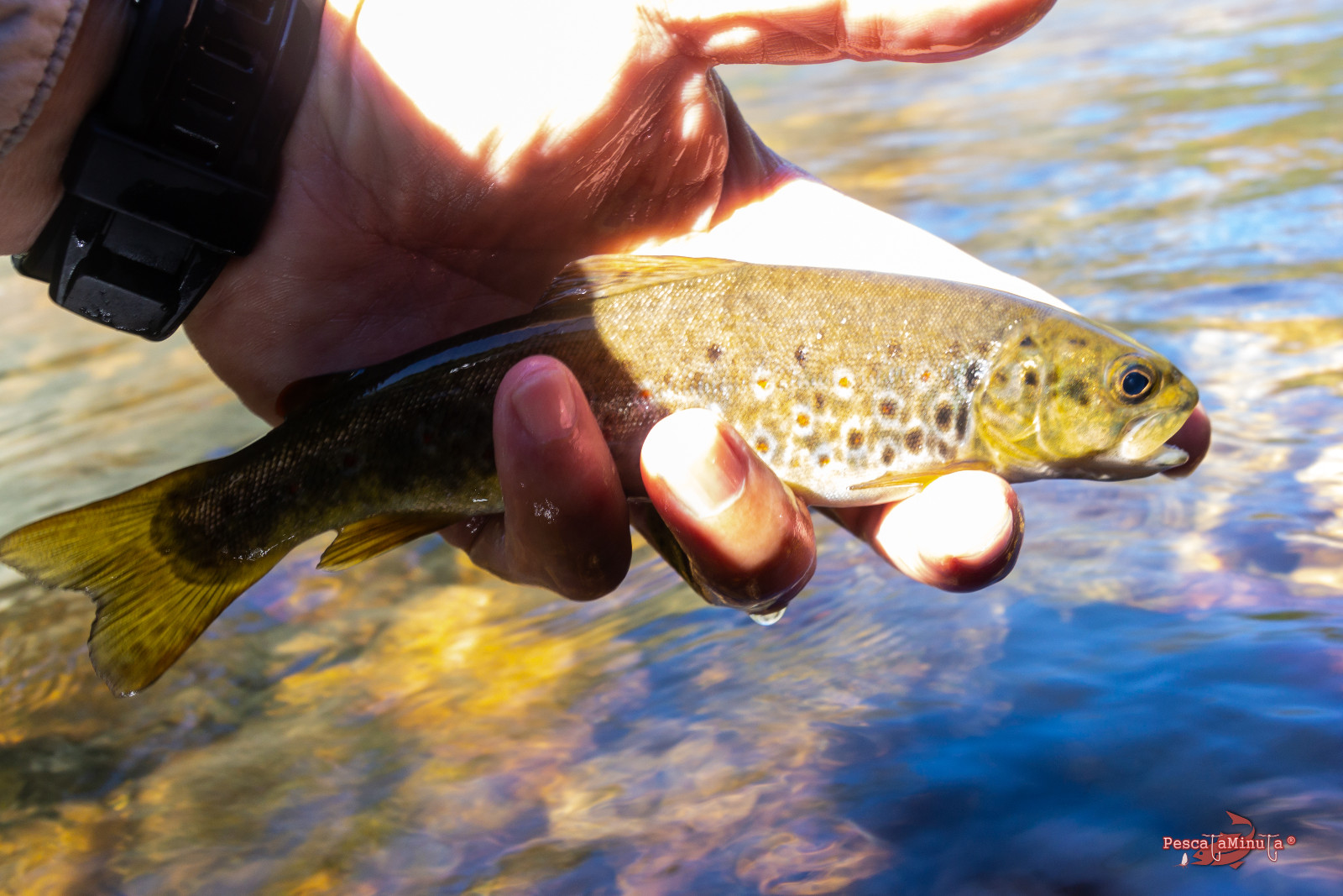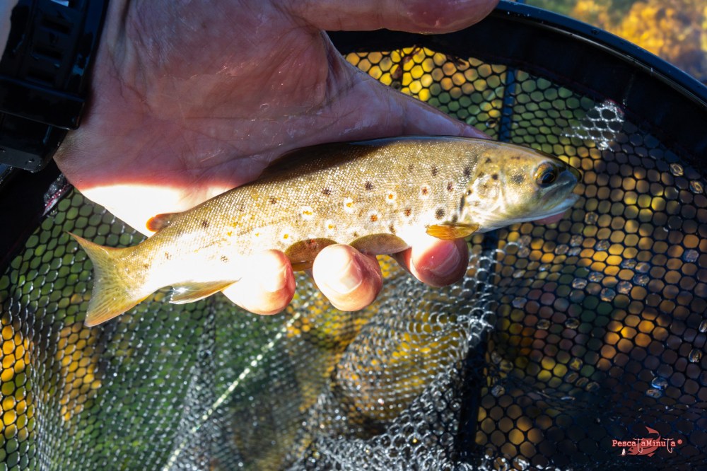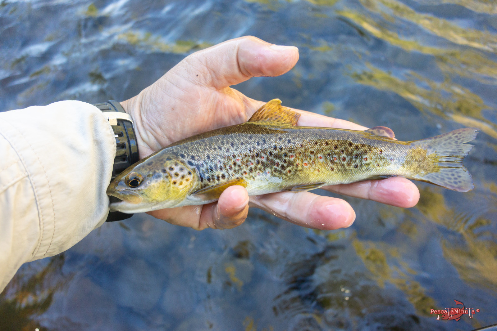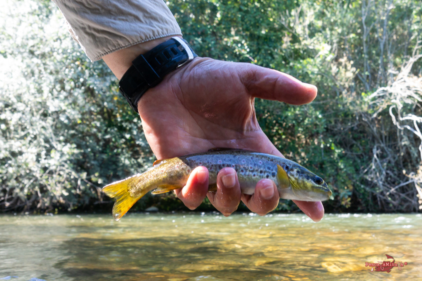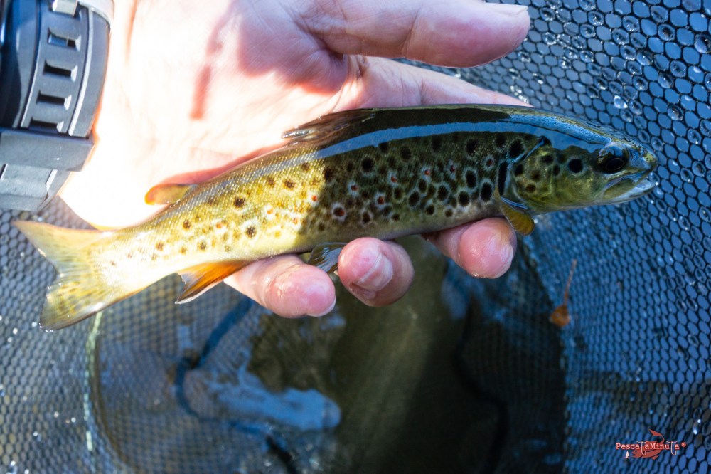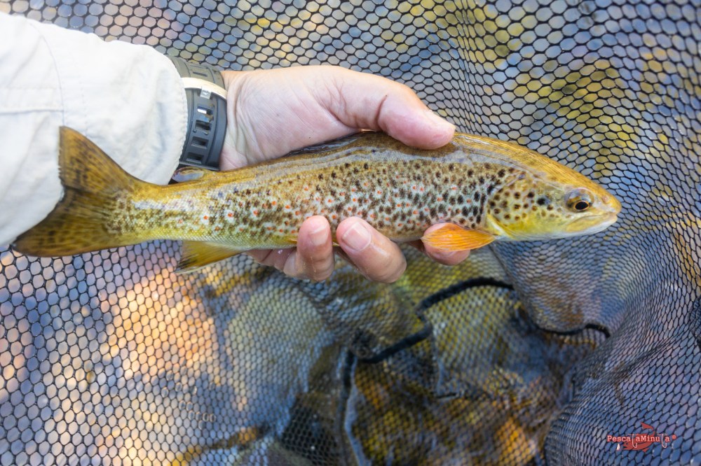 Tras el pequeño descanso e hidratación, lancé el tricóptero varias veces sin éxito, por lo que cambié de mosca atando una pequeña efémera pardina en un 18, que era lo que parecía que eclosionaba en ese momento y que tomaban las truchas de esta tabla. Y efectivamente, la primera en la frente, una trucha tomó la mosca confiada en la primera deriva. Dando tres truchas más en pocos minutos.