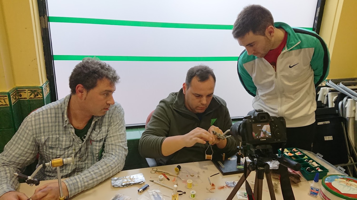 Se aprovecha para cubrir bien el encuentro e inmortalizar los momentos más interesantes o cachondos del día. Donde además de unos primeros planos de las moscas confeccionadas, filmamos el paso a paso de ciertos patrones que subimos a los respectivos canales de YouTube de PescataMinuta y RIBERFLY, de los que os aconsejo echéis un vistazo y os suscribáis.