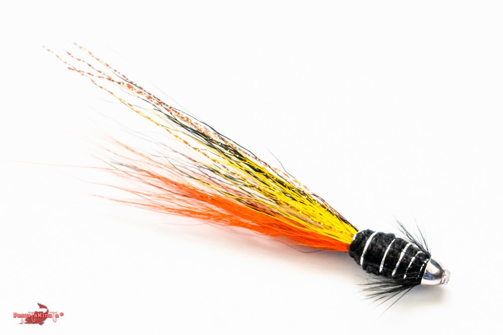 Cola: mechones de bucktail amarillo, naranja y negro, 6 fibras de crystal flash alrededor