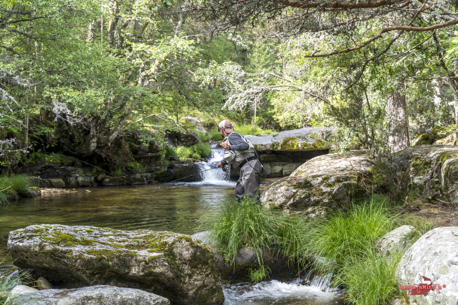 Tras varias pozas buenas, con varias capturas muy seguidas, seguimos avanzando por el último tercio del tramo, donde la dificultad en su recorrido es máxima, es una zona más embarrancada y llena de obstáculos, grandes rocas y árboles caídos a nuestro paso, nos van frenando en el ritmo de pesca. El río se encajona por momentos y tenemos que ir sorteando las posturas más adecuadas para echar las ninfas con cierto éxito. Así también el ritmo de las capturas disminuye considerablemente. Era el momento de hacer otro descanso y comentar la faena.