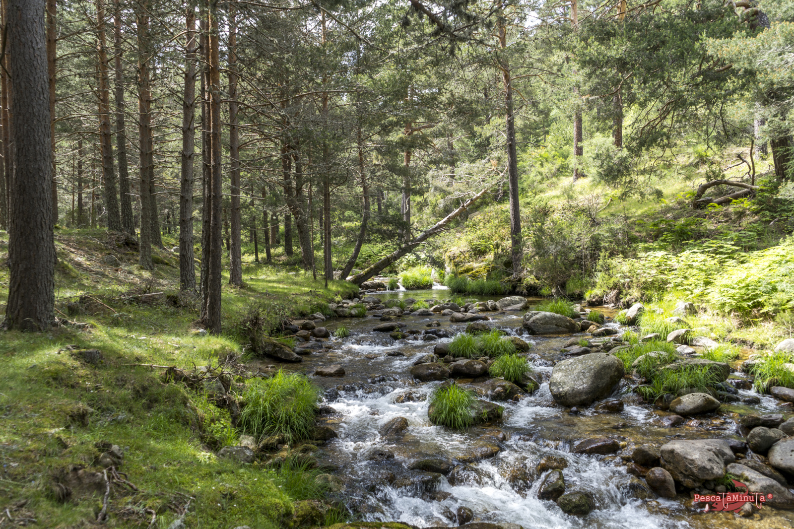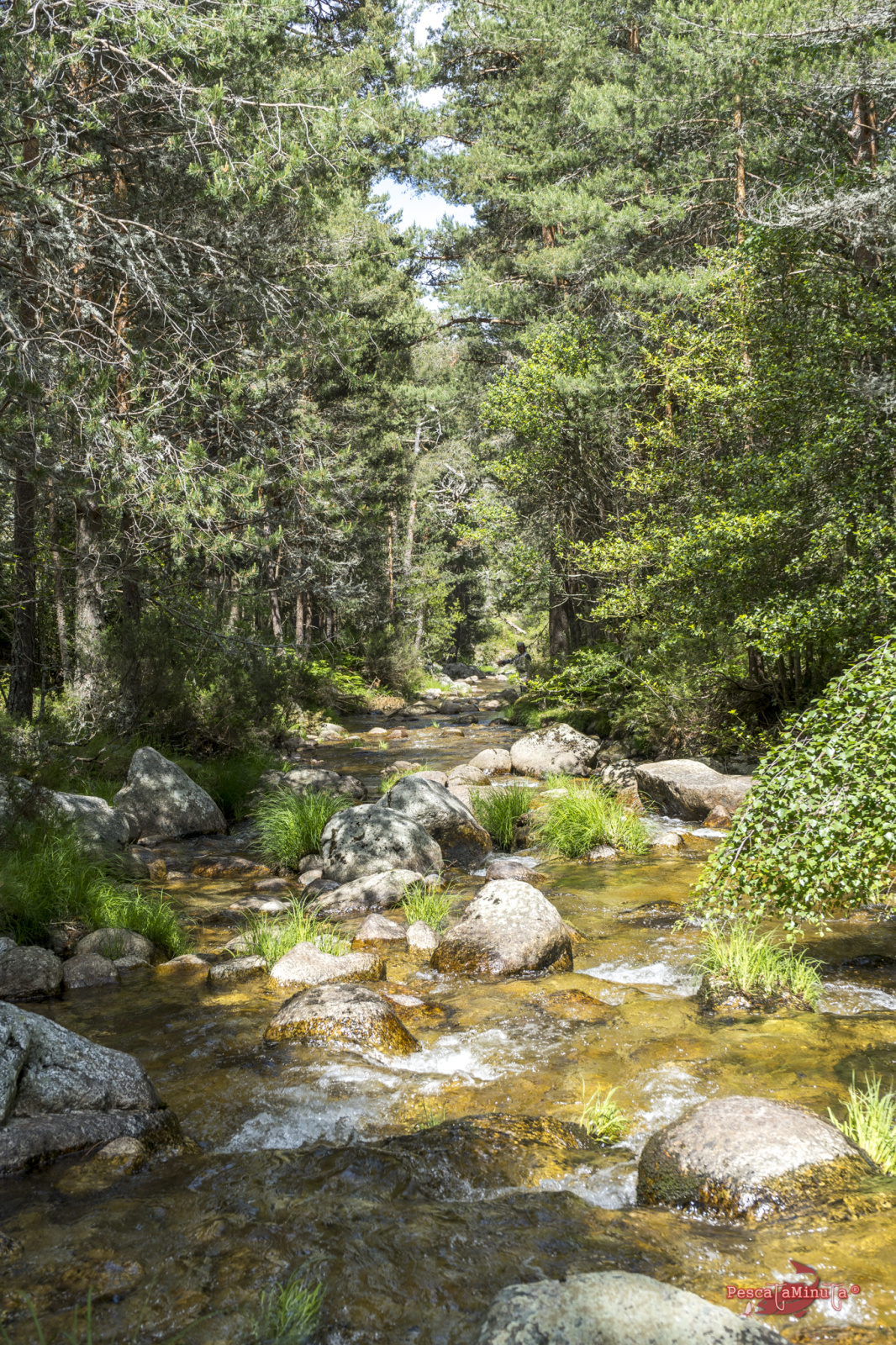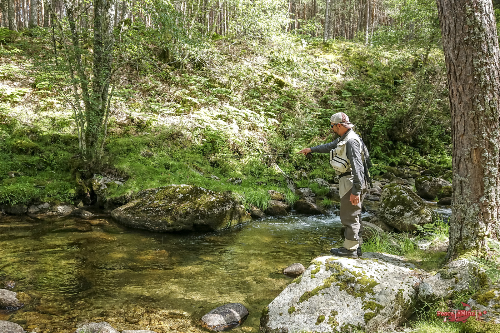Los tramos de alta montaña son exigentes, normalmente hay que saltar entre las rocas, subir laderas para esquivar vegetación y posicionarse bien en la postura. Dependiendo de la orografía nos vamos a encontrar distintos obstáculos que nos impedirán pasear cómodamente por alguna senda paralela al margen del río y aunque los hay, estos precisamente se encuentran en los cursos más llanos donde el río es más somero y apenas guarda peces. Las truchas normalmente buscarán corrientes y pozas más profundas donde poder esconderse. Así que hacia las 13:00 estábamos sentados a la sombra de unos pinos refrescándonos, almorzando y reponiéndonos del esfuerzo de la caminata de la mañana. Mientras nos deleitamos con el magnífico paisaje que teníamos delante, los sonidos del bosque y la visita de algún pájaro curioso. Estábamos muy a gusto, el sol en lo más alto, pero con una temperatura muy agradable en el valle que rondaría los 17/18°.