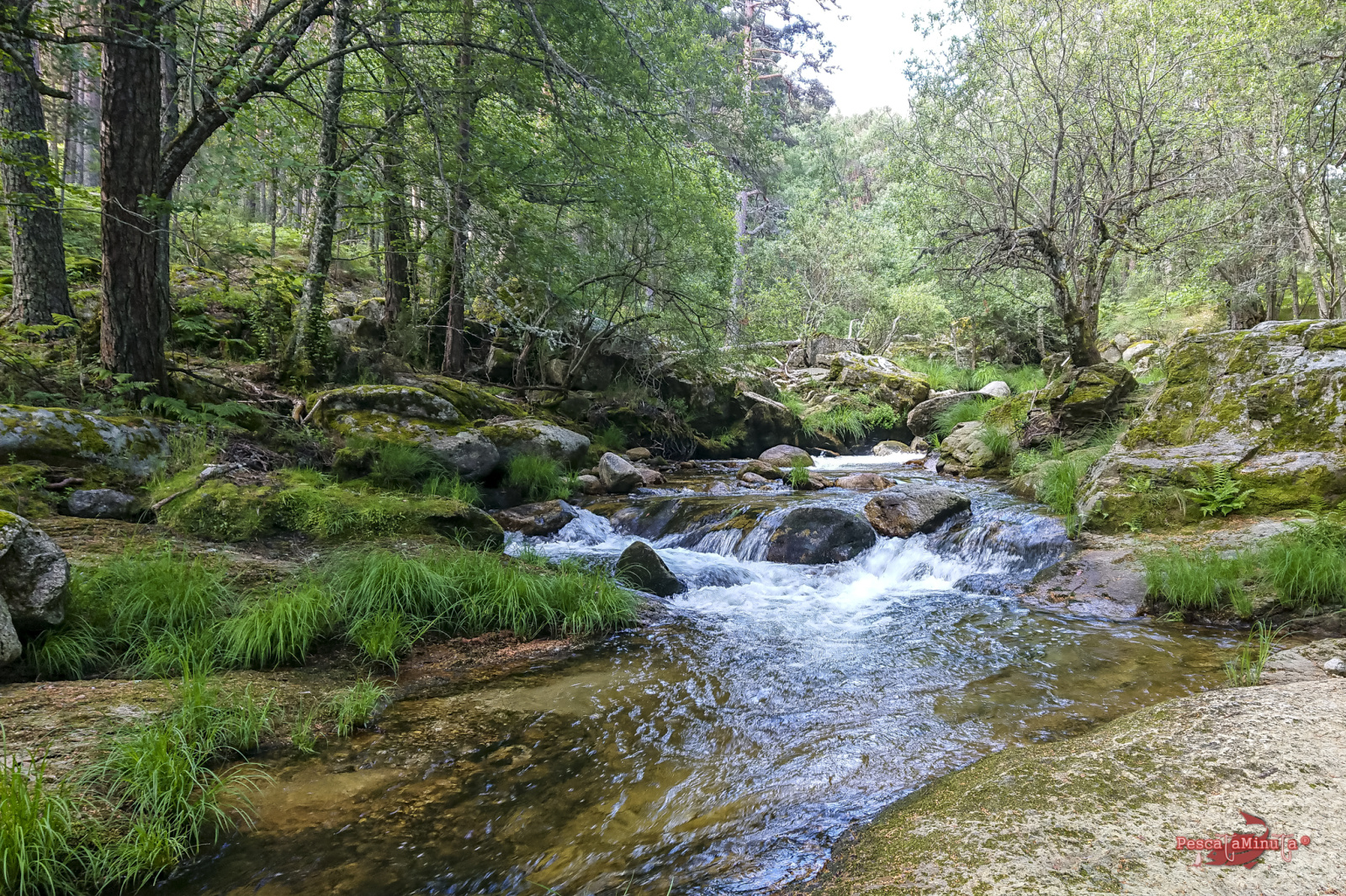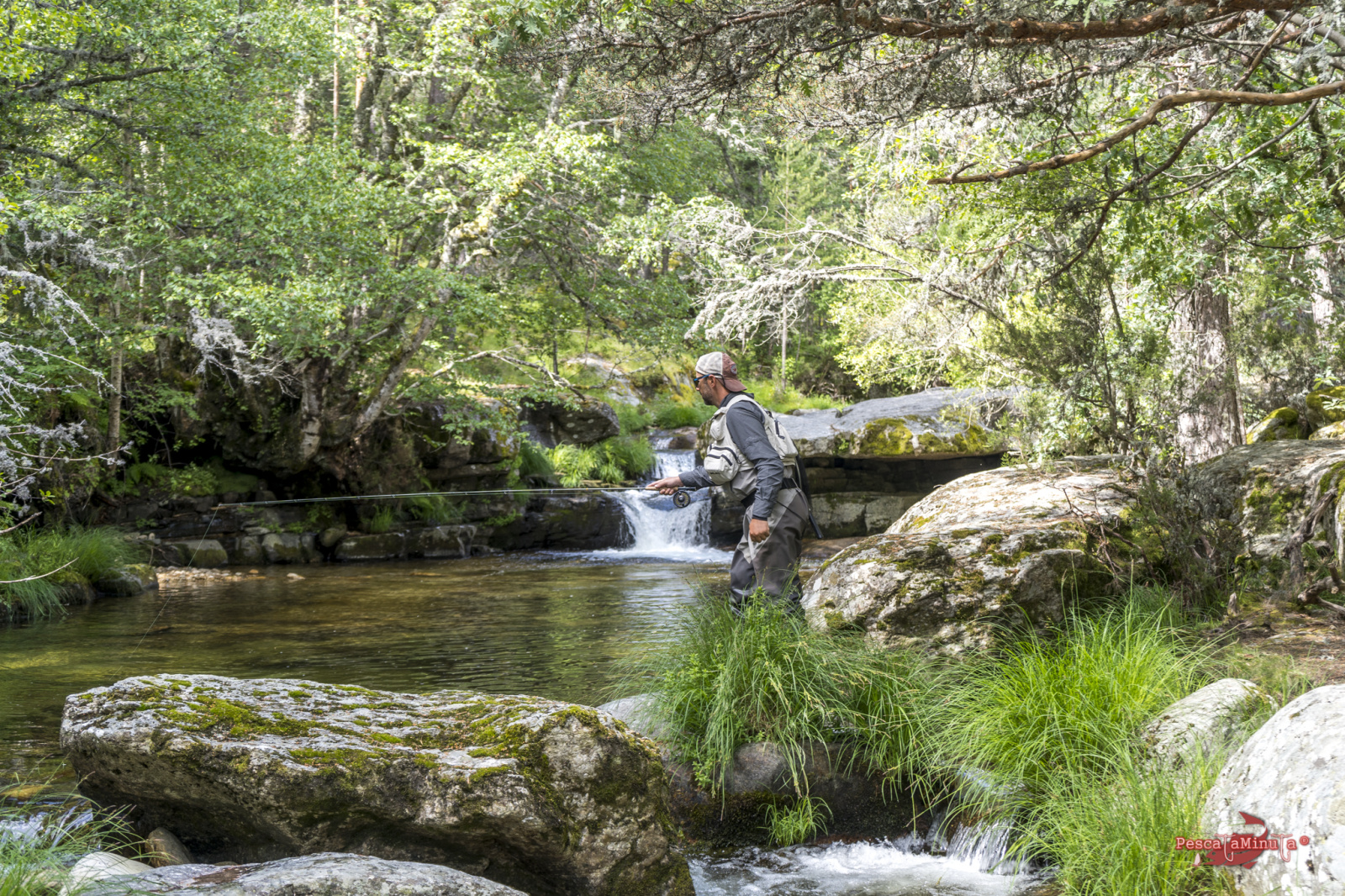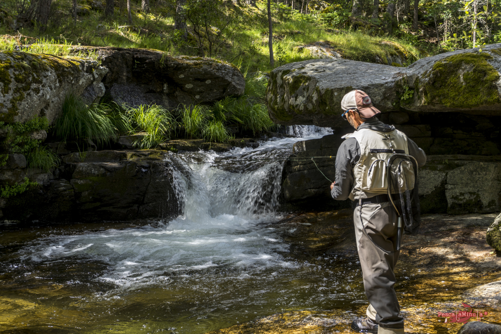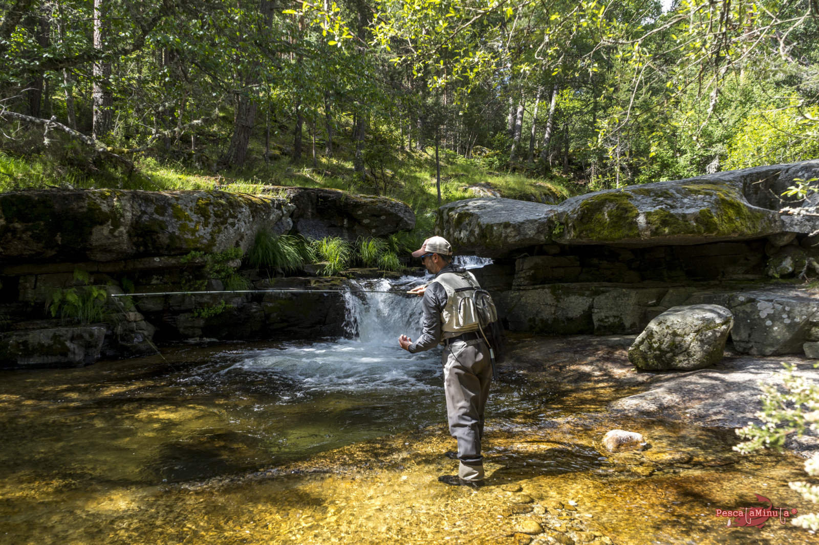 Los tramos de alta montaña son exigentes, normalmente hay que saltar entre las rocas, subir laderas para esquivar vegetación y posicionarse bien en la postura. Dependiendo de la orografía nos vamos a encontrar distintos obstáculos que nos impedirán pasear cómodamente por alguna senda paralela al margen del río y aunque los hay, estos precisamente se encuentran en los cursos más llanos donde el río es más somero y apenas guarda peces. Las truchas normalmente buscarán corrientes y pozas más profundas donde poder esconderse. Así que hacia las 13:00 estábamos sentados a la sombra de unos pinos refrescándonos, almorzando y reponiéndonos del esfuerzo de la caminata de la mañana. Mientras nos deleitamos con el magnífico paisaje que teníamos delante, los sonidos del bosque y la visita de algún pájaro curioso. Estábamos muy a gusto, el sol en lo más alto, pero con una temperatura muy agradable en el valle que rondaría los 17/18°.