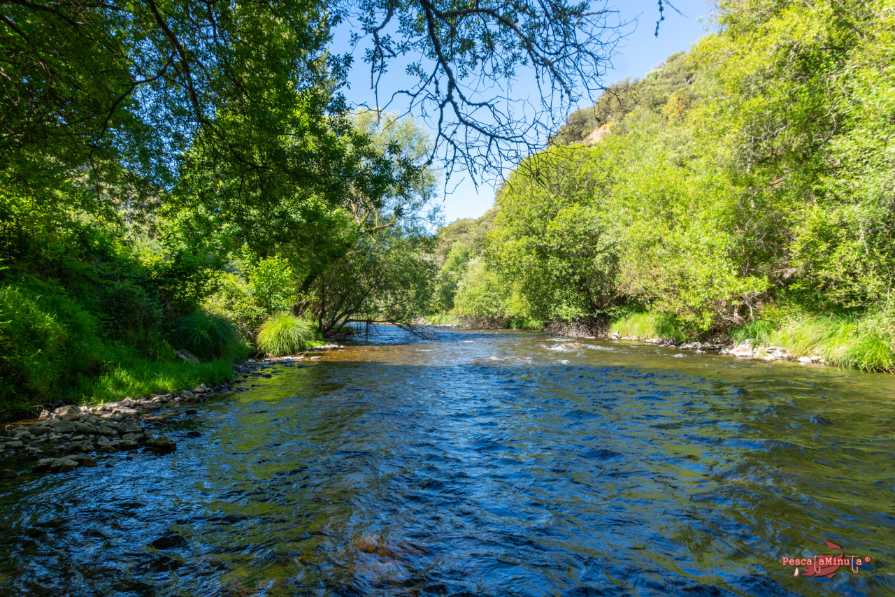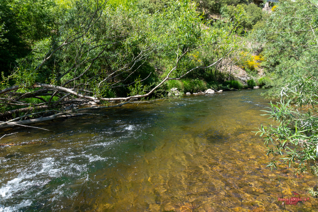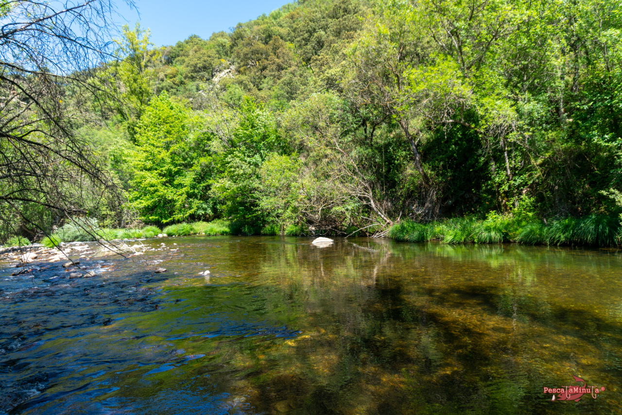A partir de aquí el río vira en un ángulo de 45º y las aguas son más someras y sus dos orillas más pobladas de árboles y vegetación ribereña. Hay que ir entrando y saliendo del río con frecuencia para situarse cómodamente en las posturas más tentadoras. Voy pescando estas aguas con algo más de brío y las tres truchas que logro capturar se dan en la misma vena de agua con algo más de profundidad en la orilla derecha.