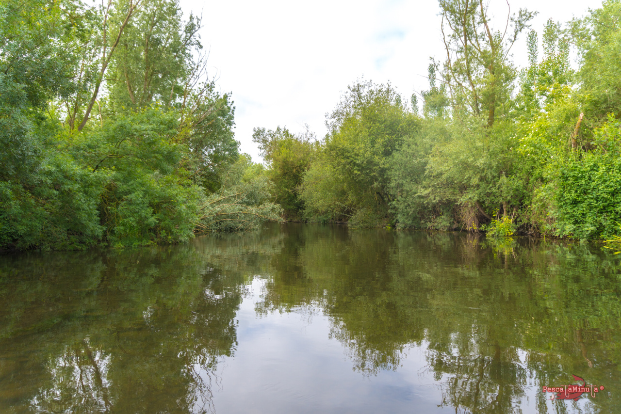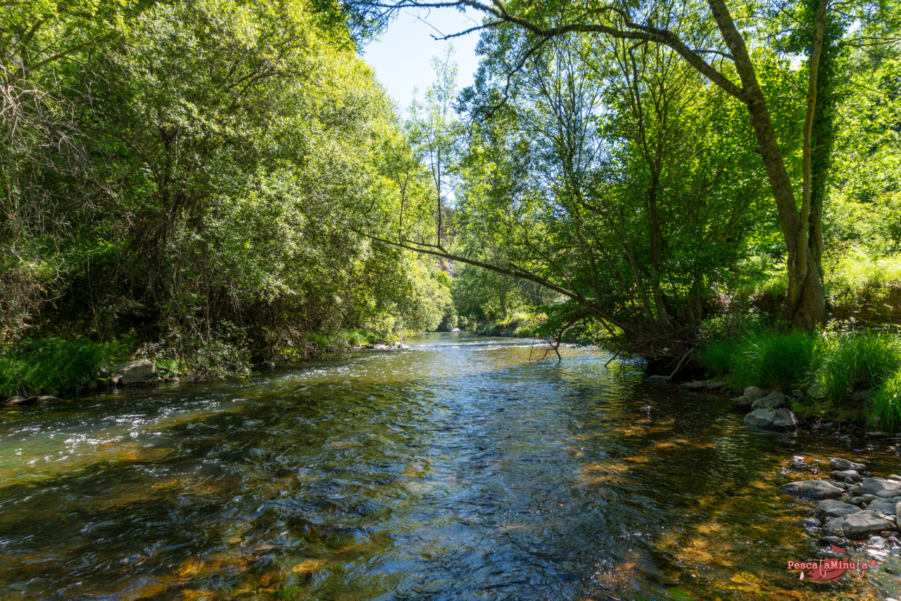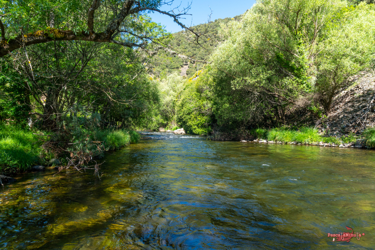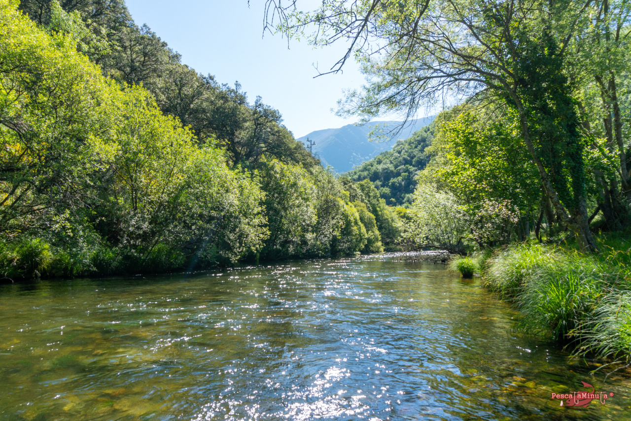 A partir de aquí el río vira en un ángulo de 45º y las aguas son más someras y sus dos orillas más pobladas de árboles y vegetación ribereña. Hay que ir entrando y saliendo del río con frecuencia para situarse cómodamente en las posturas más tentadoras. Voy pescando estas aguas con algo más de brío y las tres truchas que logro capturar se dan en la misma vena de agua con algo más de profundidad en la orilla derecha.