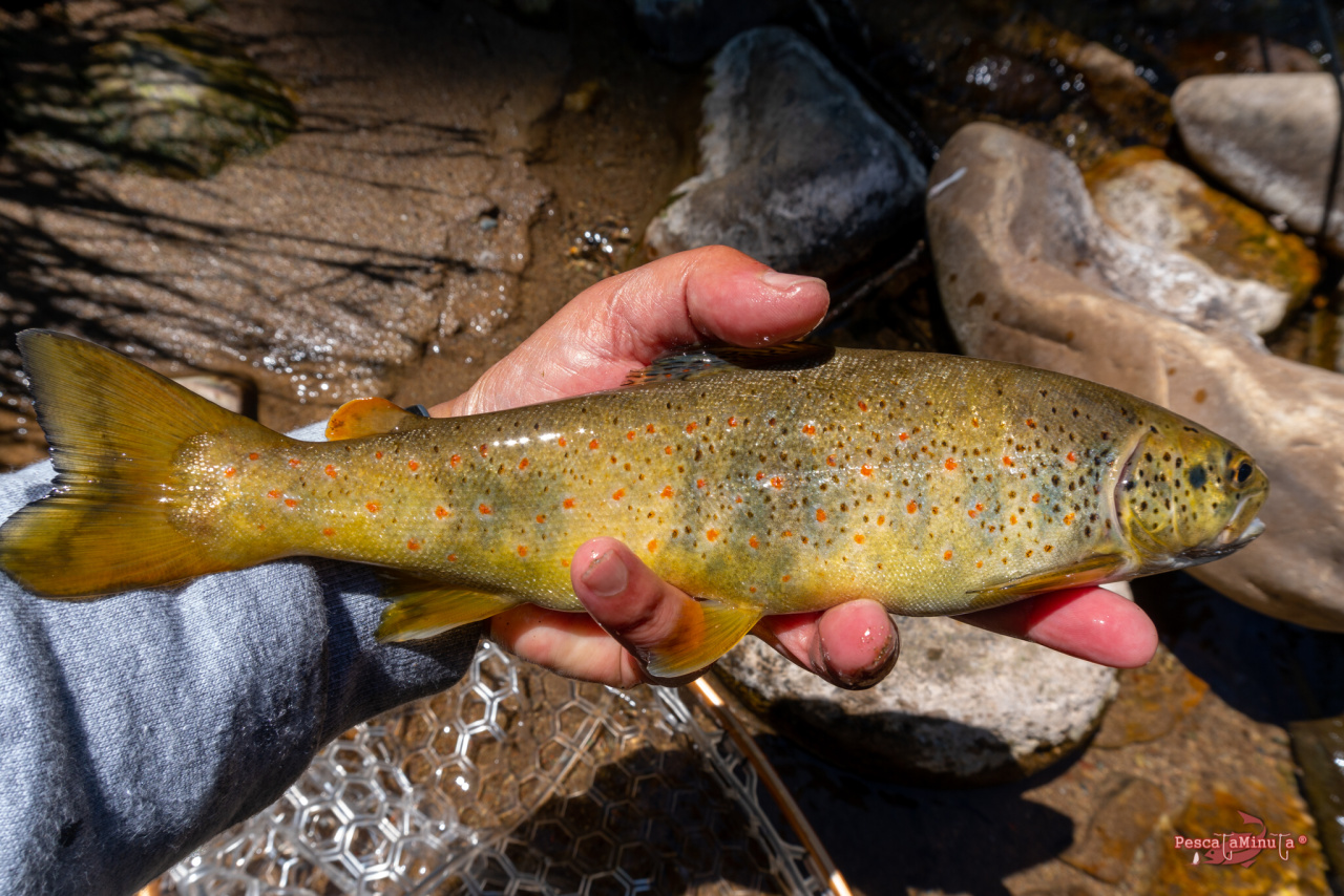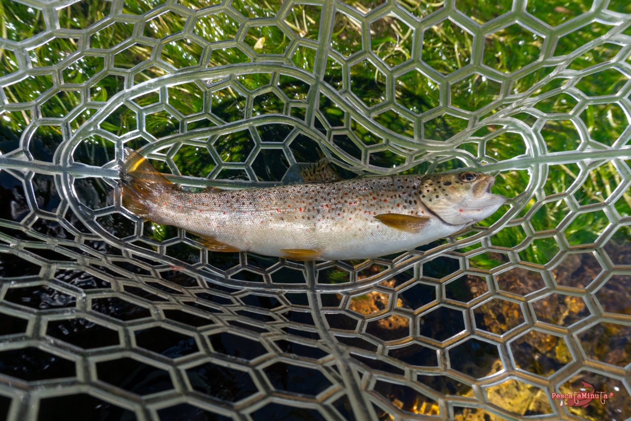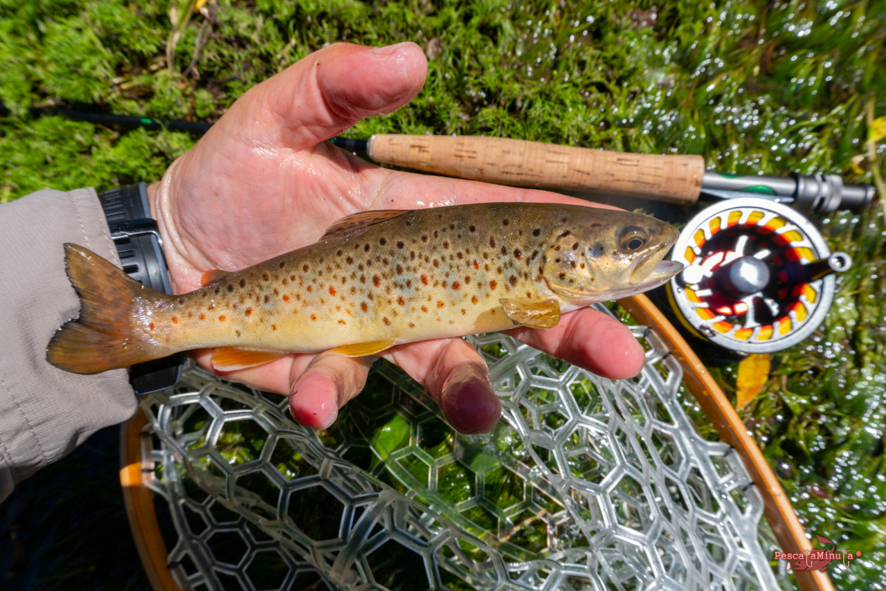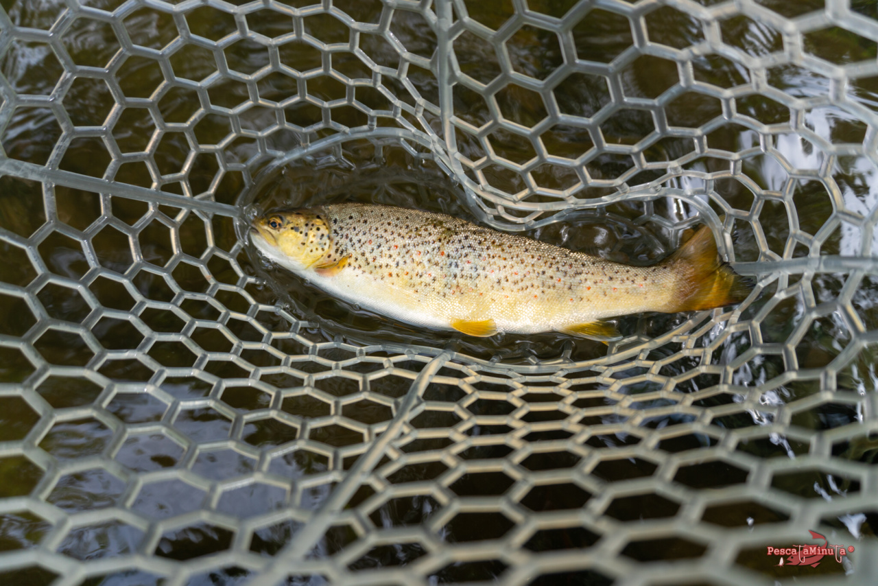 Peinando bien la zona y cubriendo las posturas tanto desde una orilla como de la otra, se van sucediendo las picadas, algunas fallidas por cierto, y es que es como si tocaran las ninfas pero no las quisieran comer realmente. Pero otras pican con voracidad y saltan fuera del agua la mayoría de las veces. En apenas 100 metros recorridos, había conseguido llevar 8 truchas a la sacadera y otras pocas falladas y aunque ninguna destacable, todas ellas de libreas preciosas.