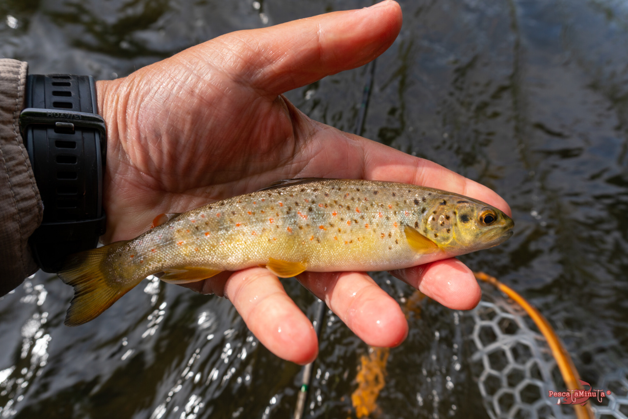 Es casi la hora de salir del río, se hace tarde para comer y volver a casa, pero apuro los últimos momentos en unas corrientes suaves donde veo truchas que se ceban. Algunas efémeras y tricópteros están apareciendo y las truchas se animan a subir selectivamente. Ato en el terminal una Rhithrogena y efectuado el primer lance clavo la primera trucha y maja. En los minutos finales consigo antes de dar por terminada la jornada, otras tres truchas pequeñas caen a la sacadera.